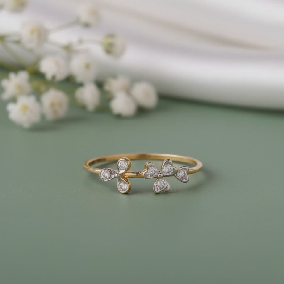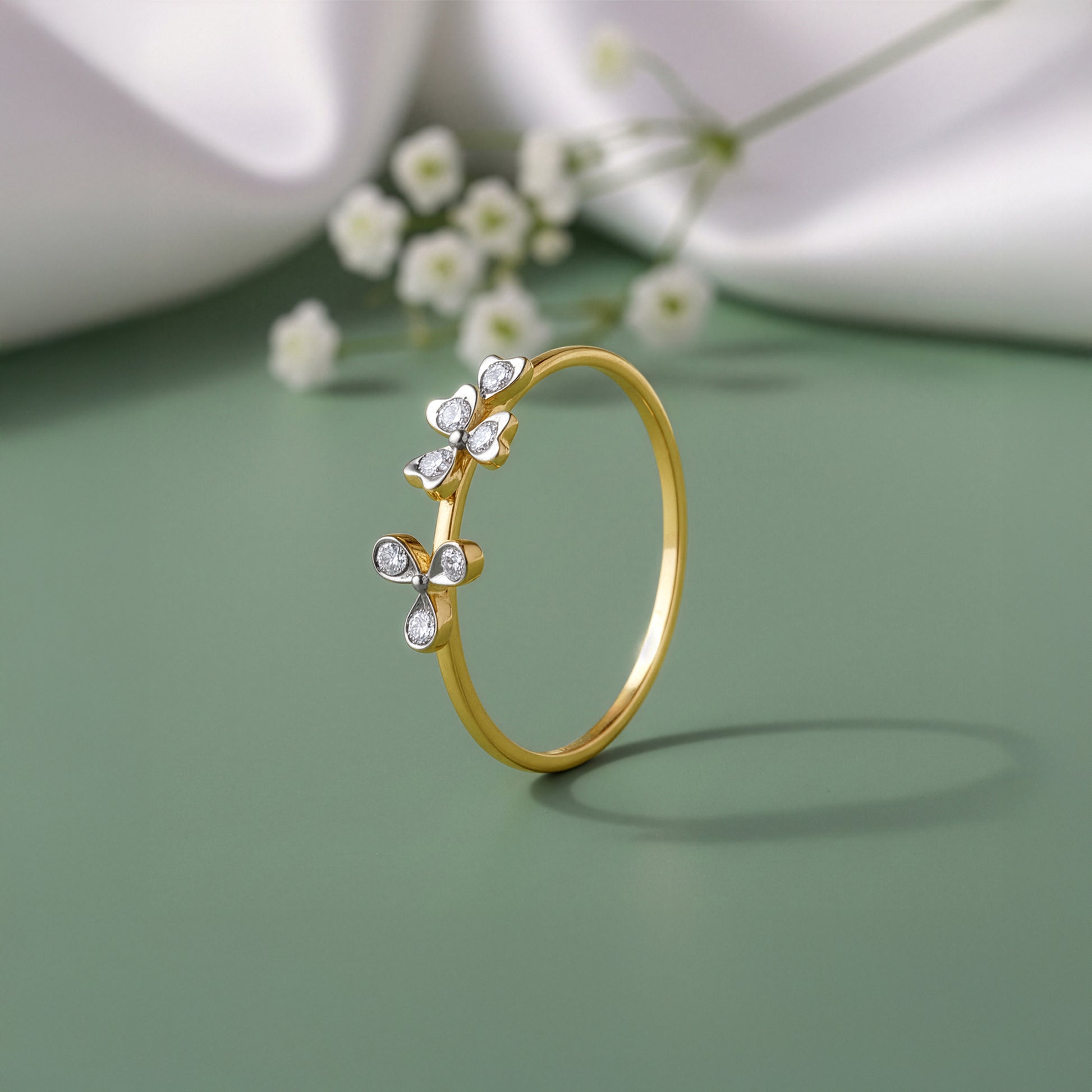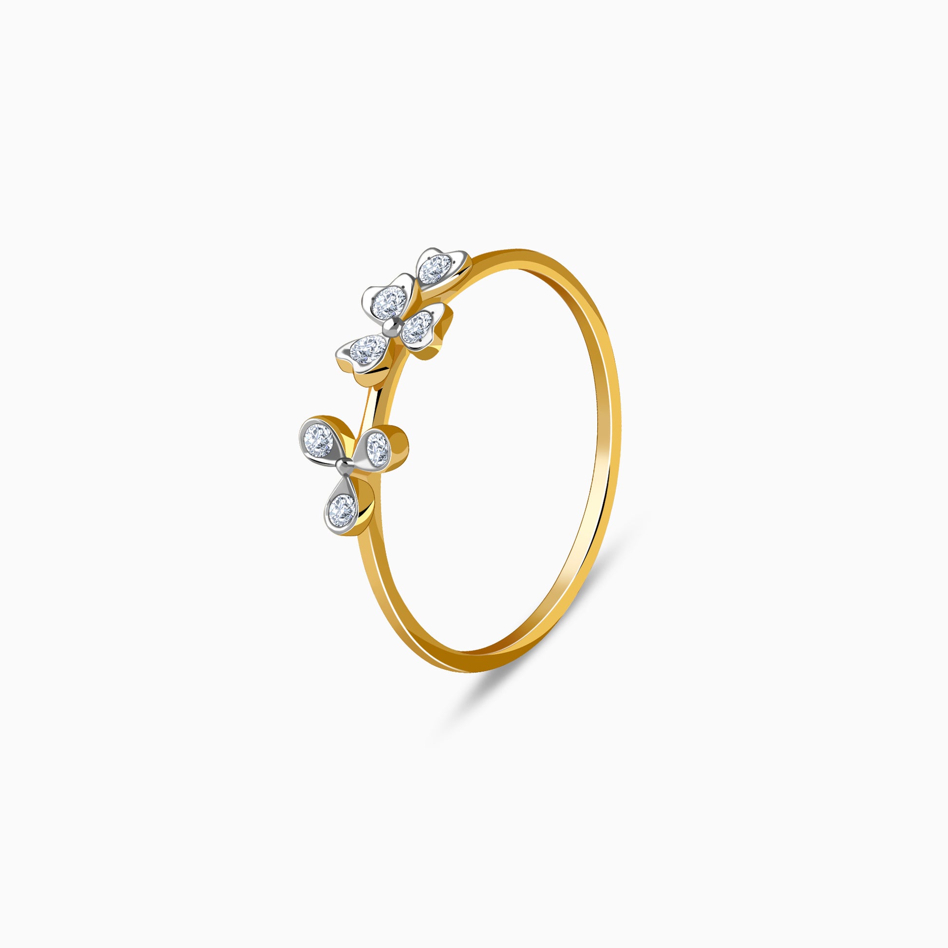 A gold ring centred around a three petal floral motif set with lab grown diamonds, created for the woman who prefers soft symbolism with a confident finish. Try the exquisite lab grown diamond jewellery from Heer By GIVA today.