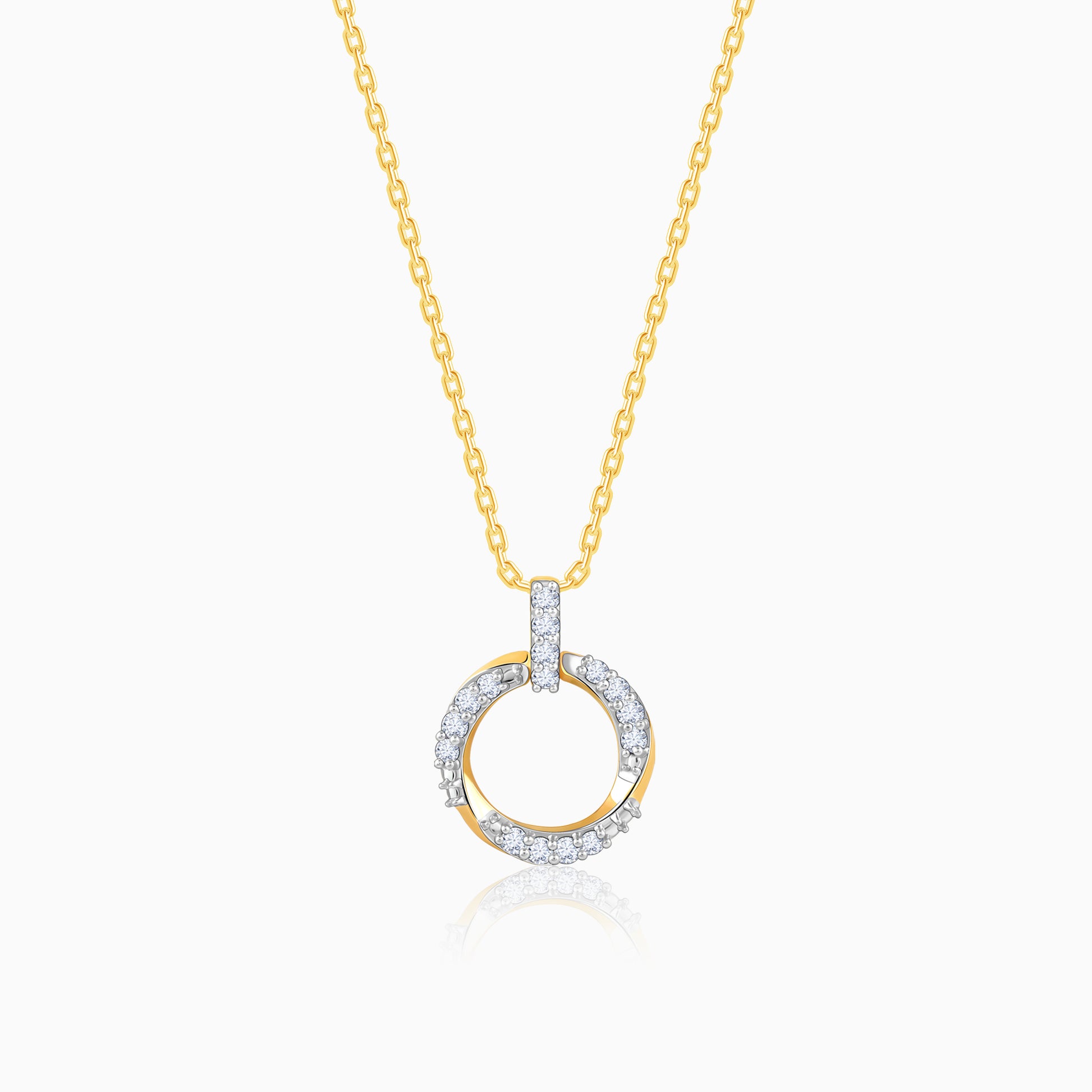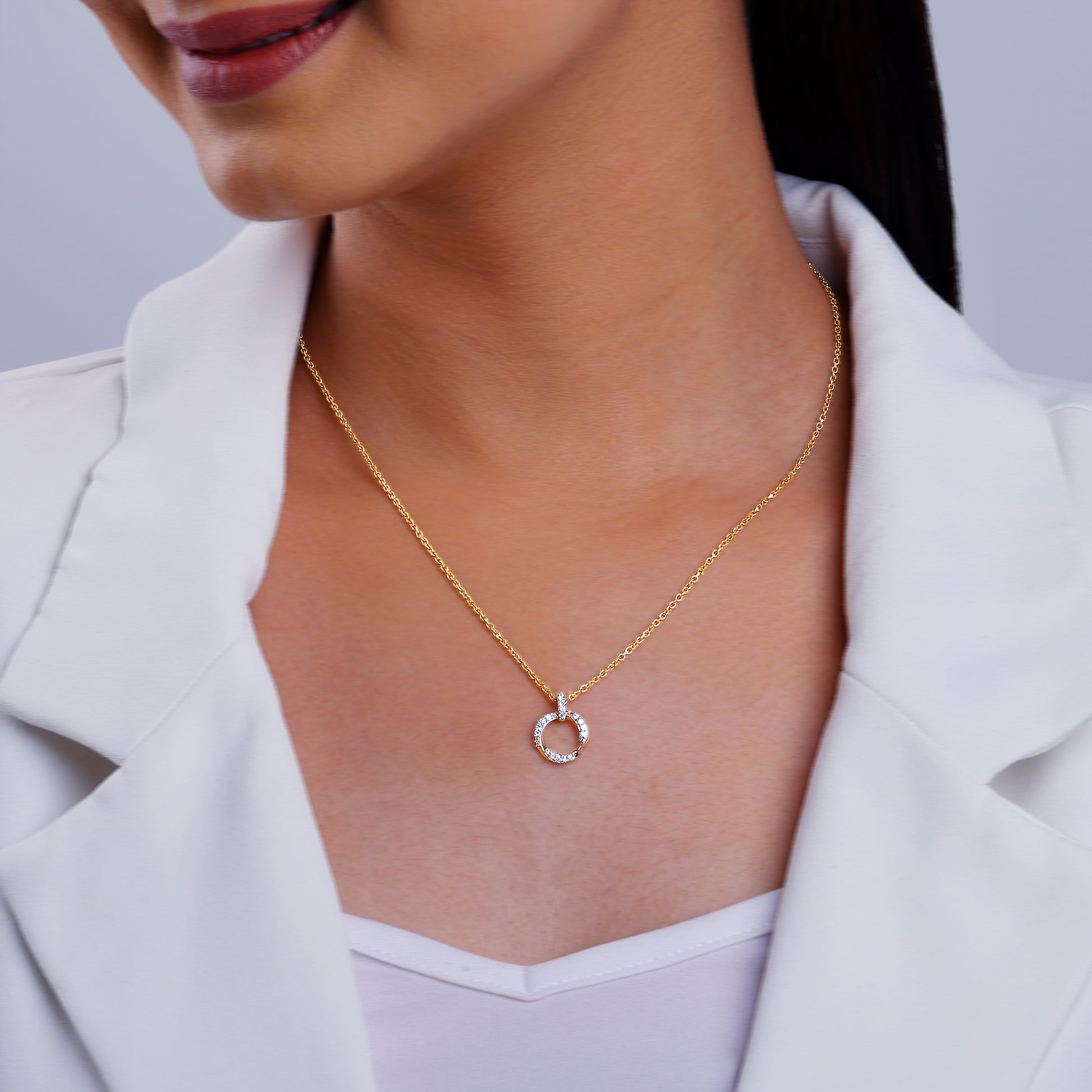 This pure gold pendant features a unique circular design, studded with lab-grown diamonds.