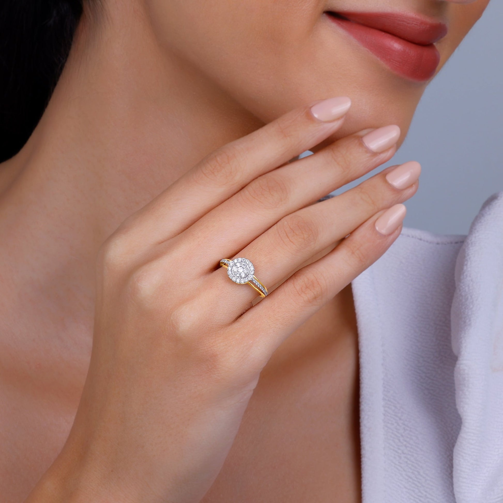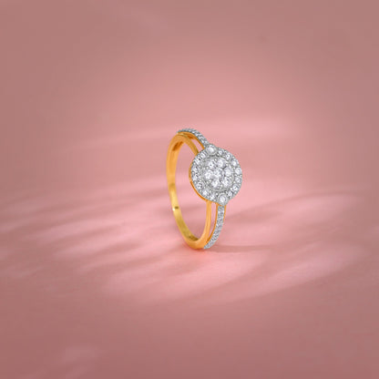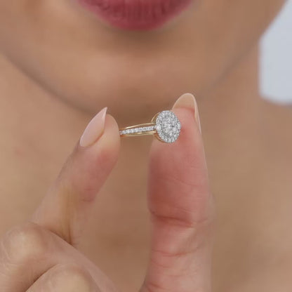 This pure gold ring for women features a cluster of diamonds in the centre, surrounded by a halo of smaller lab grown diamonds.