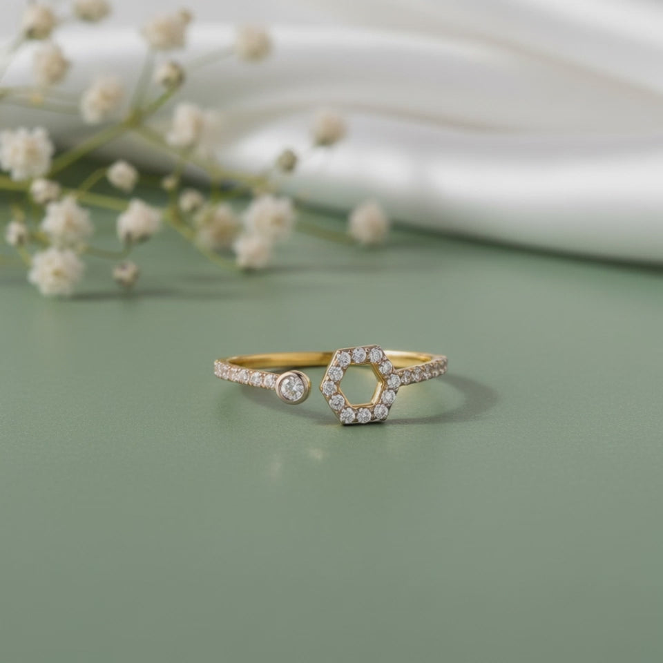 A gold ring defined by a hollow hexagon set with lab grown diamonds, balanced by a tapered gold band that rises to a single lab grown diamond at the tip. Designed for the woman who favours asymmetry and graphic form. Try the exquisite lab grown diamond jewellery from Heer By GIVA today.