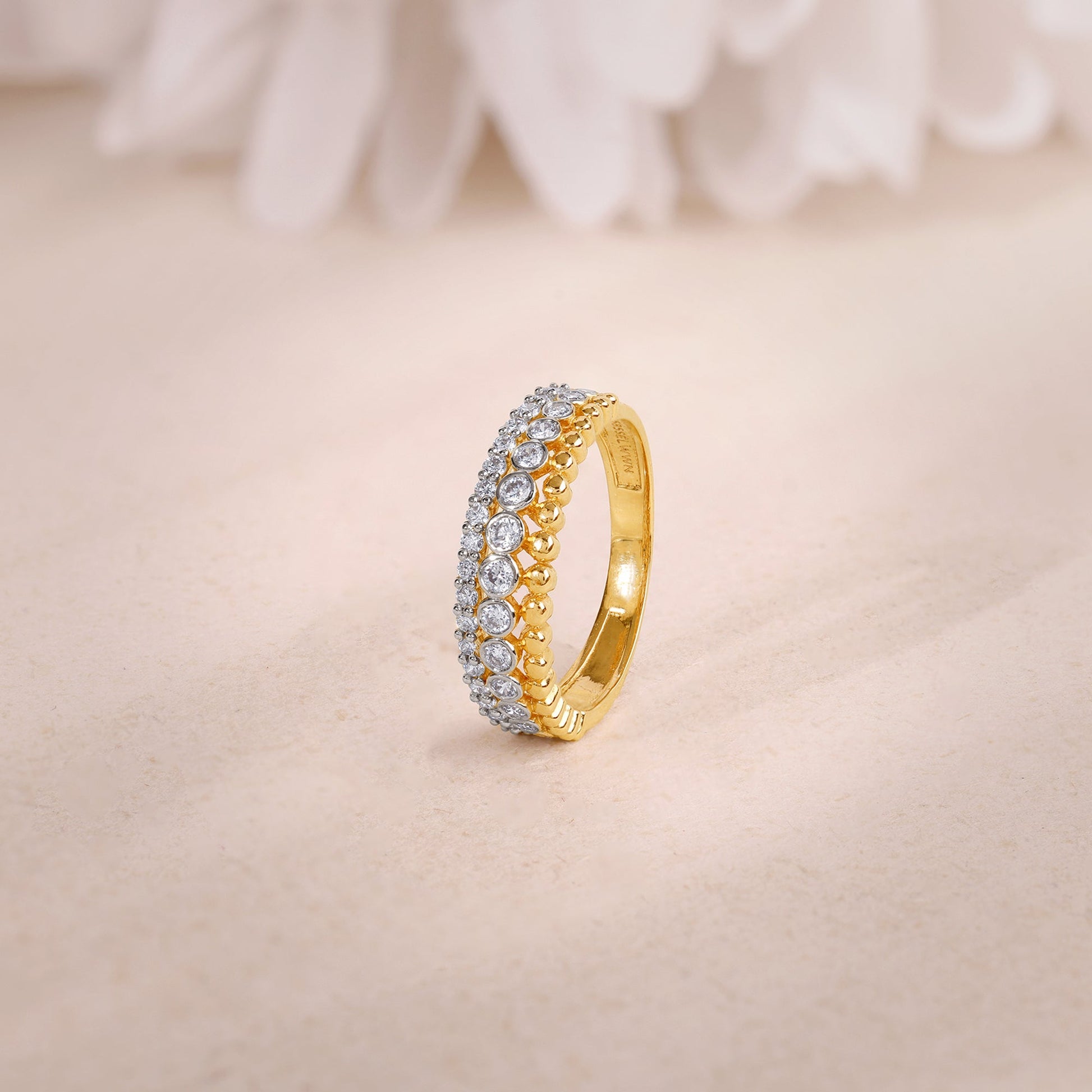 This lab grown diamond ring has three faux stack rows - one with beaded gold band, and the other two bands with bezel & pavé set diamonds - honestly a classic for diamond lovers.