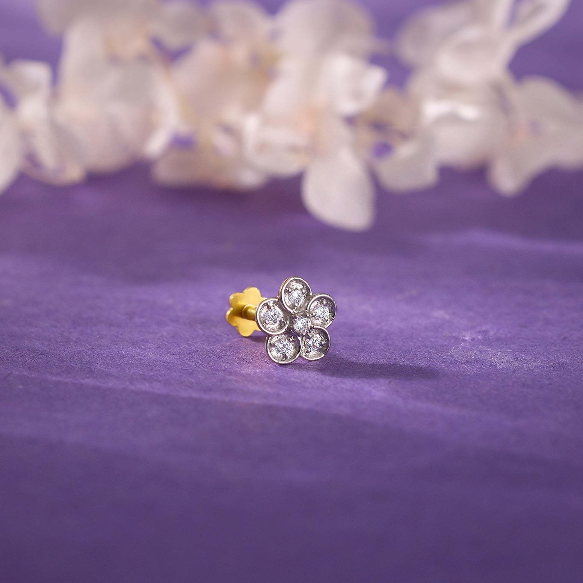 This gold nose pin features a flower motif studded with lab-grown diamonds.
