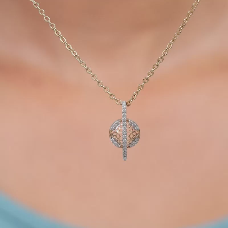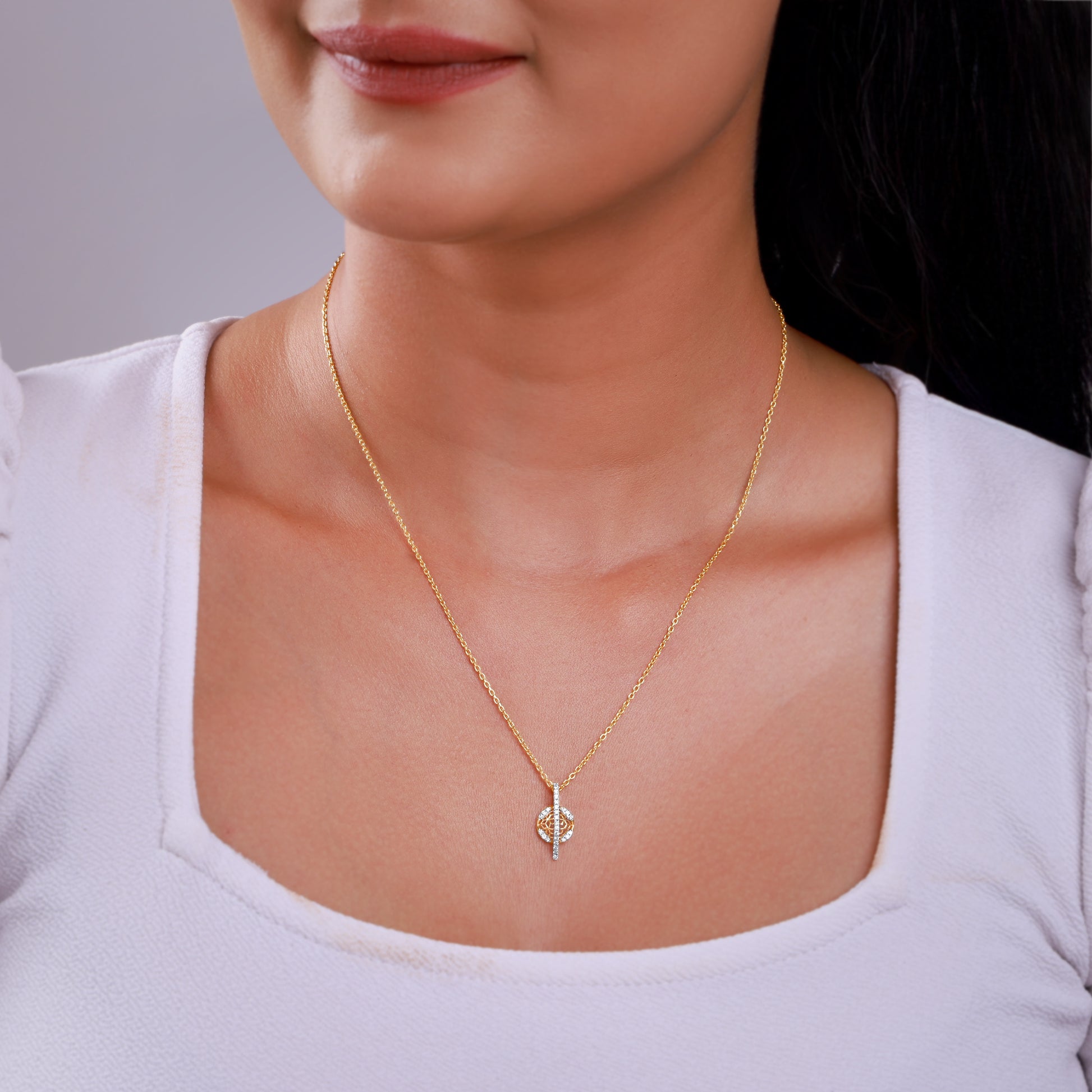 A bloom that never fades, a glow that never dims. This pure gold pendant for women features a circular silhouette with an inner honeycomb pattern, intersected by a curved vertical element. Both the outer rim and the curve are encrusted with lab grown diamonds. Try the exquisite lab grown diamond jewellery from Heer By GIVA today.