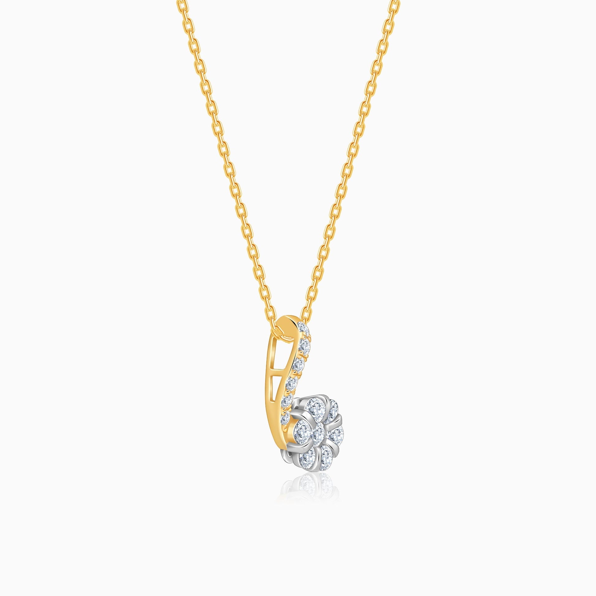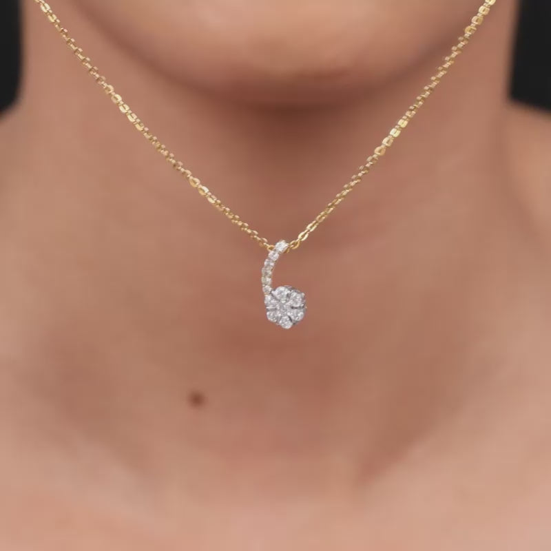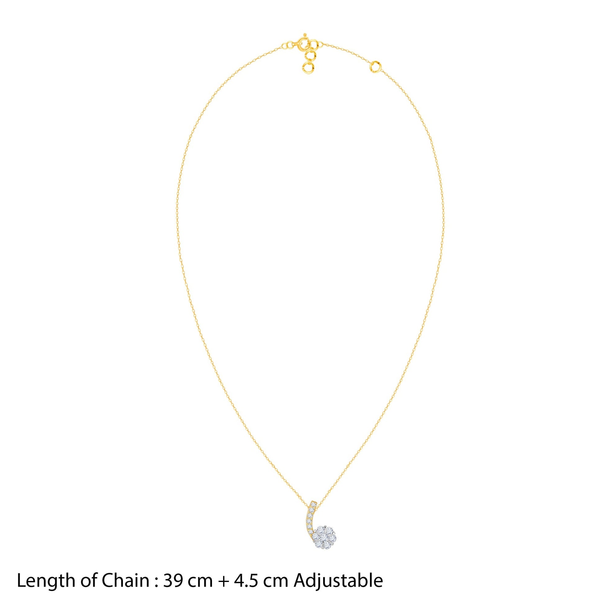 This pure gold necklace for women features a graceful, curving design. The curve culminates in a brilliant, circular cluster of lab grown diamonds at the base, creating a floral or swirling effect.