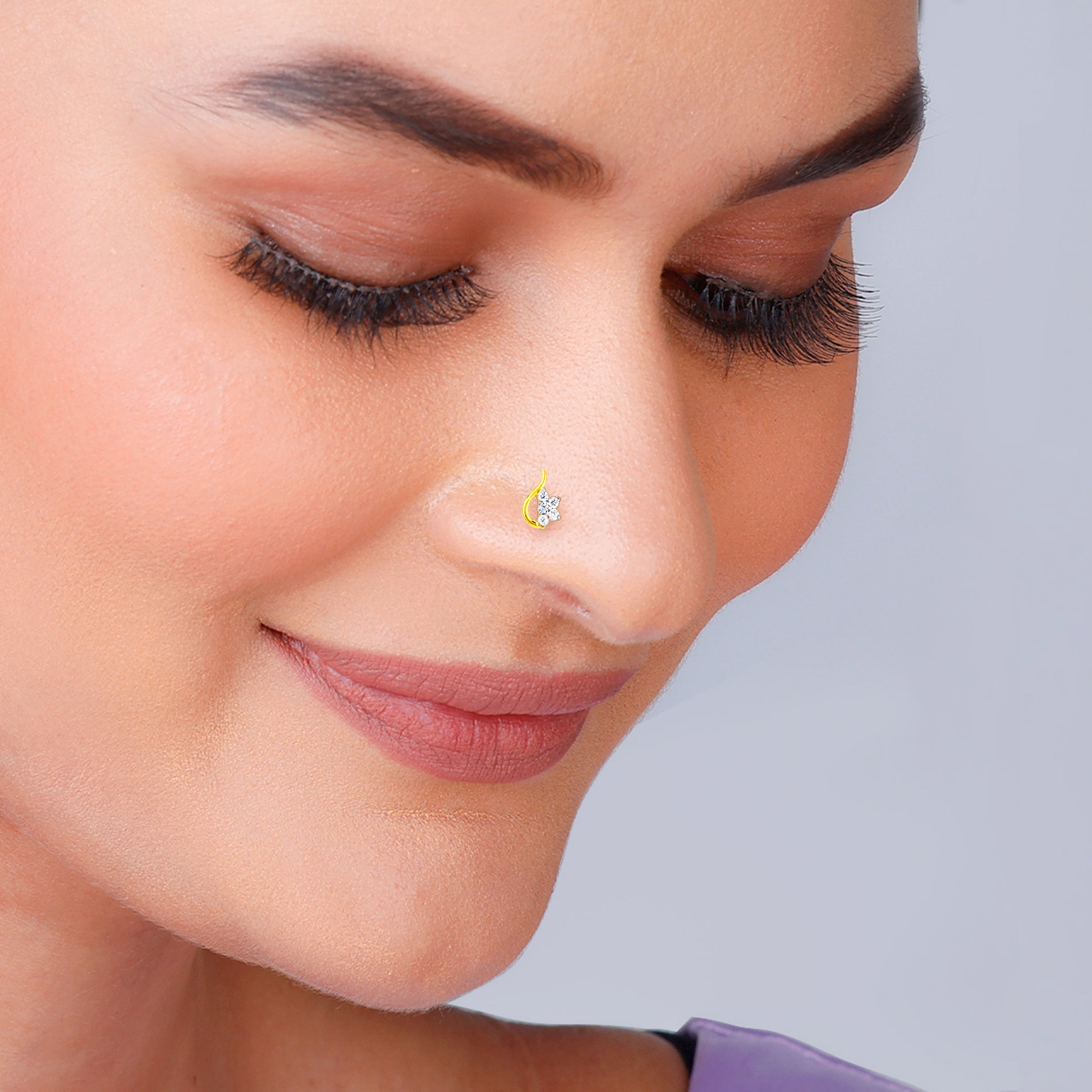 This gold nose pin has a half-flower motif set with lab-grown diamonds.