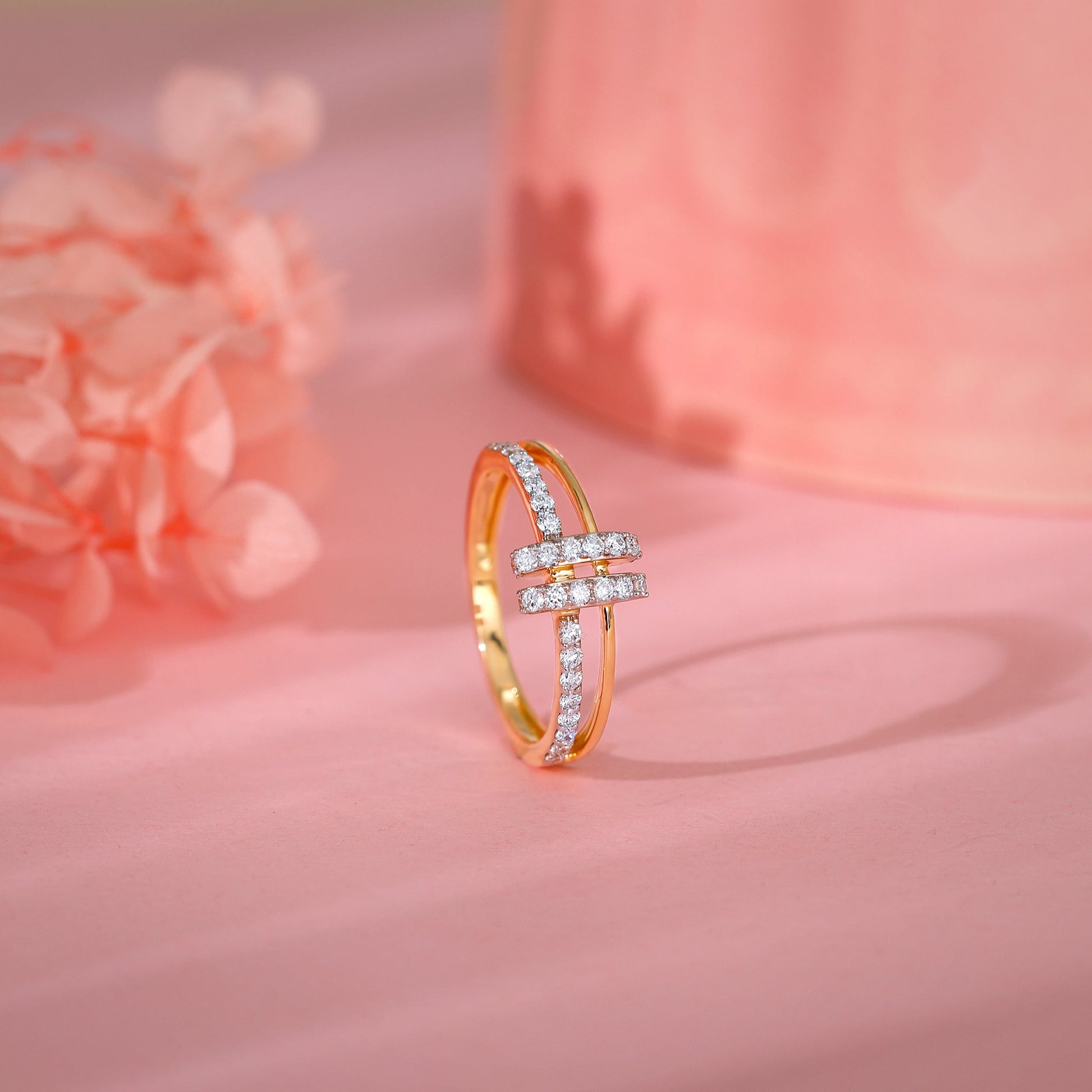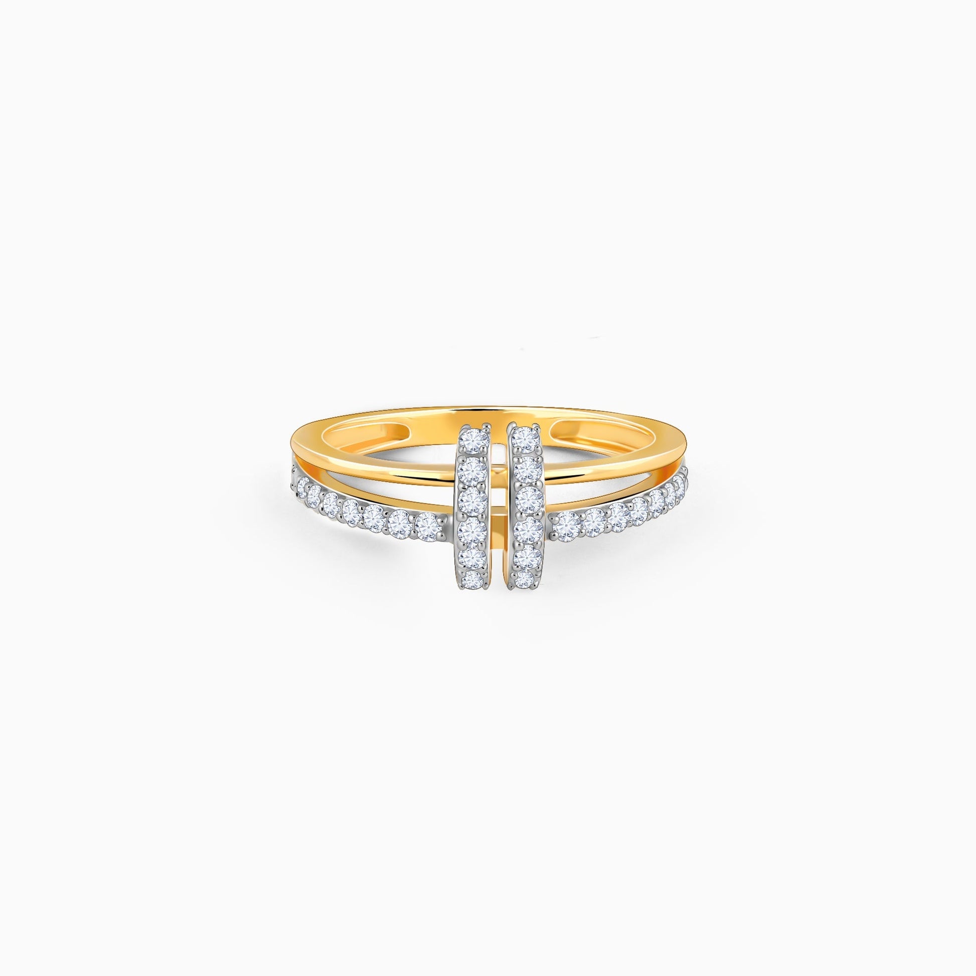 This pure gold ring features a dual-layer band, with one layer studded with lab-grown diamonds and a two-line design in the centre also studded with lab-grown diamonds.