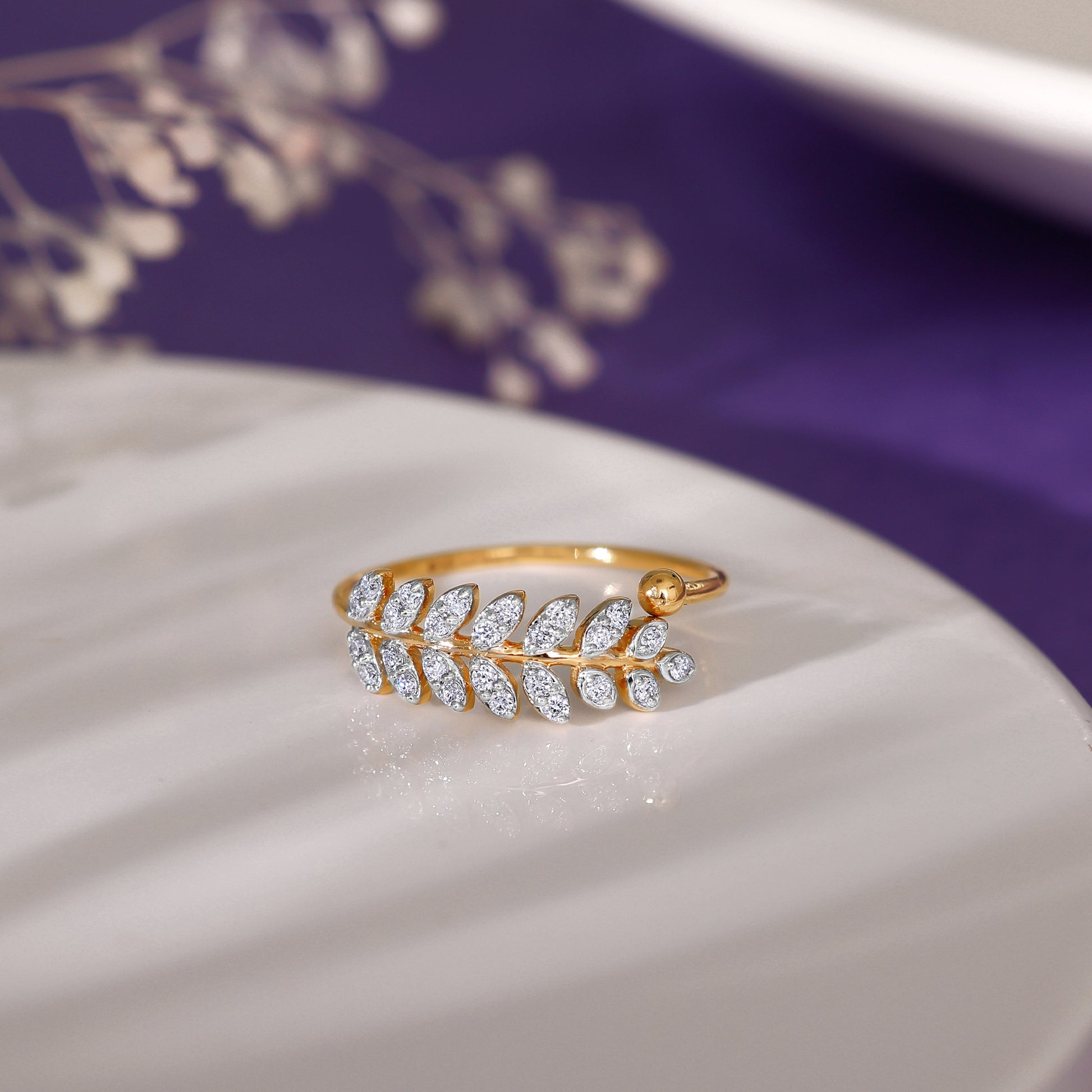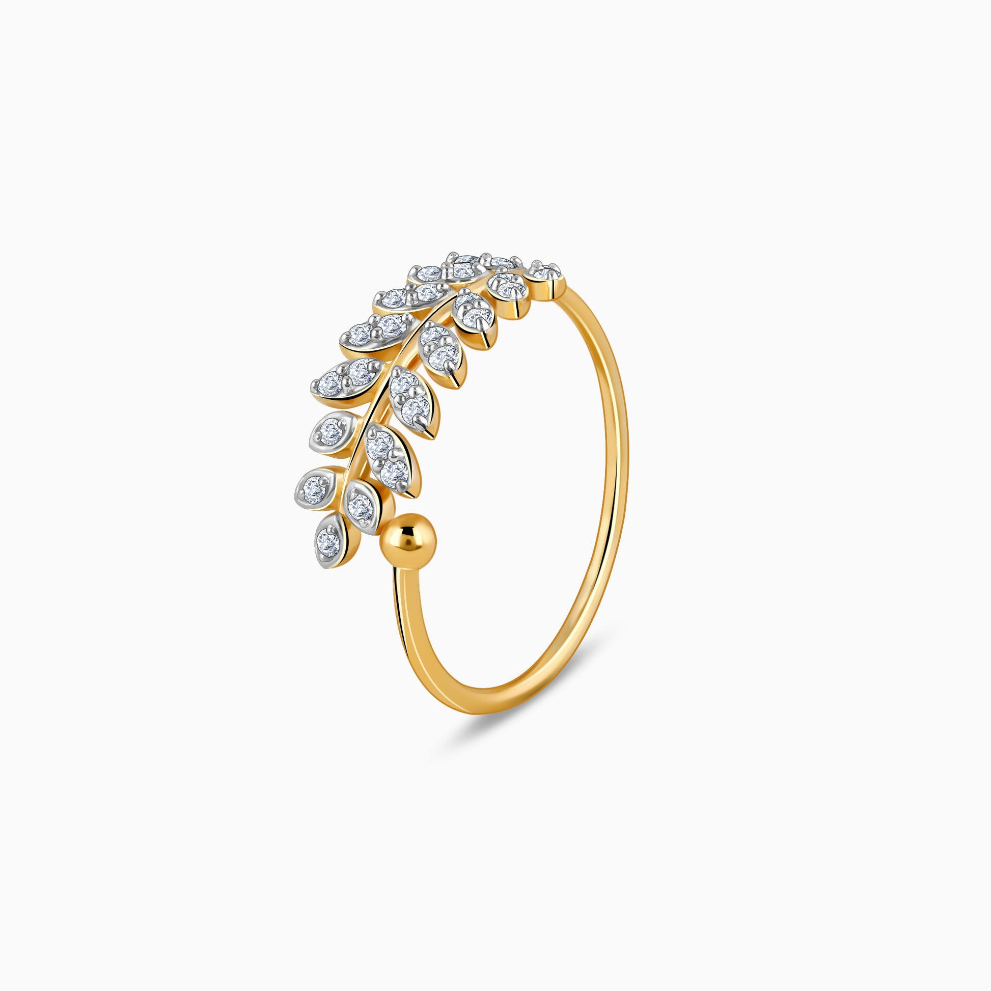 This pure gold ring features a leafy branch-like motif studded with lab-grown diamonds.