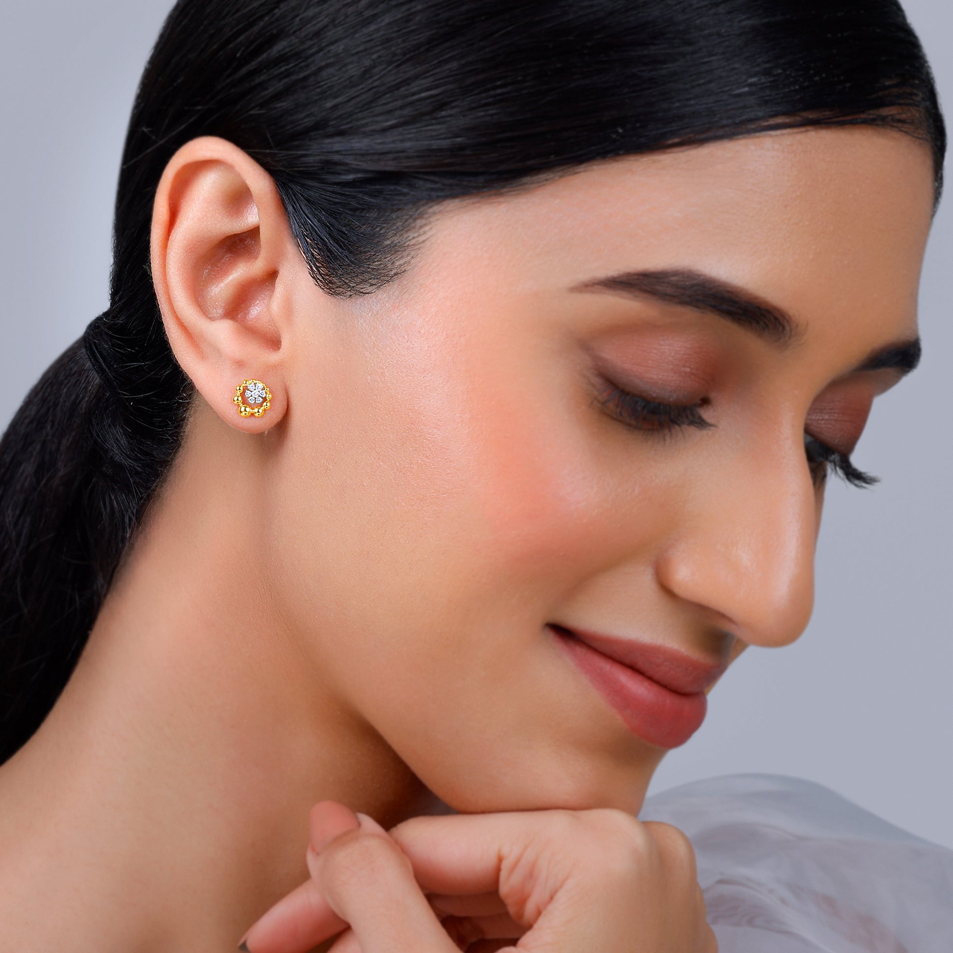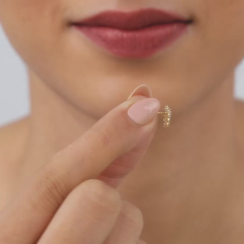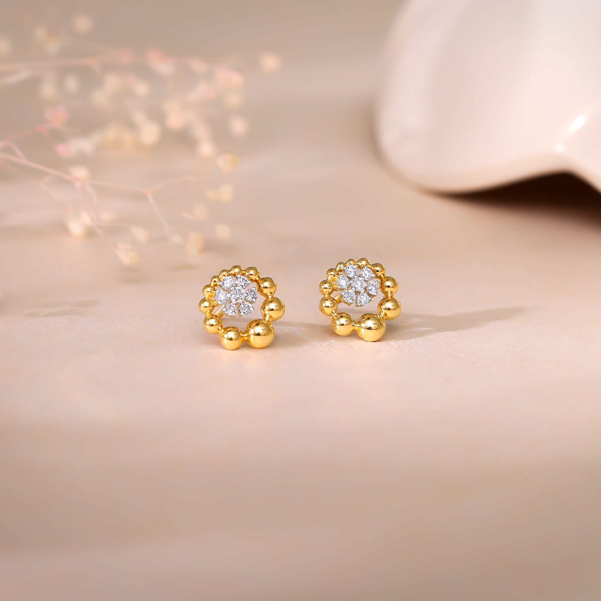 These pure gold earrings are circular in shape. It is a central cluster of lab-grown diamonds surrounded by a halo of different-sized gold 'ball' garland.