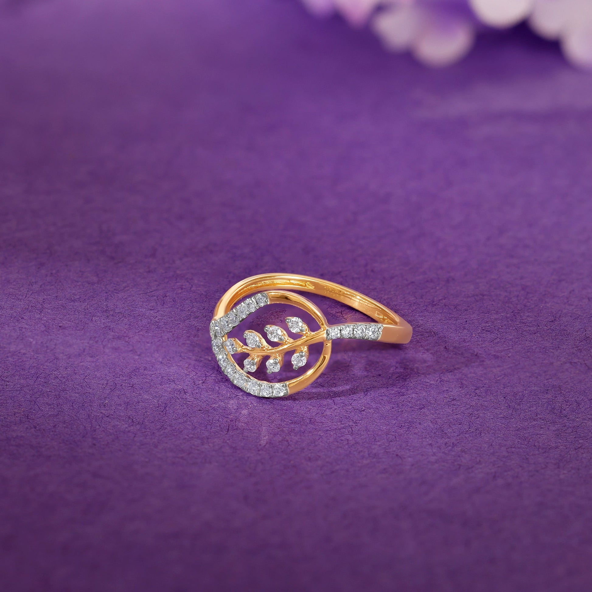 This pure gold ring for women features a leaf design studded with lab grown diamonds.