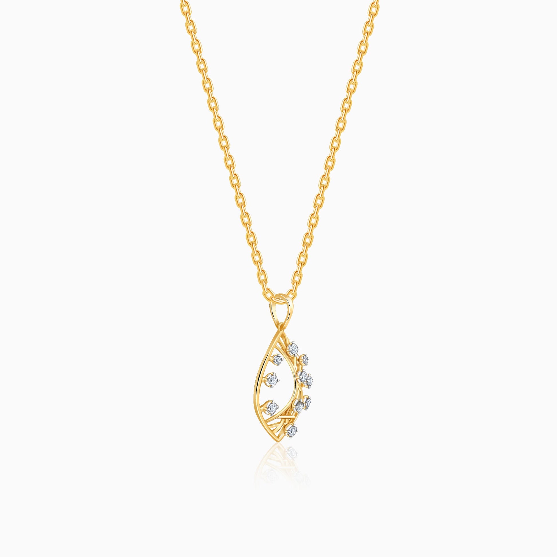 This pure gold pendant for women features a leaf-shaped design with crisscross detailing. Multiple lab grown diamonds are artistically placed across the frame.