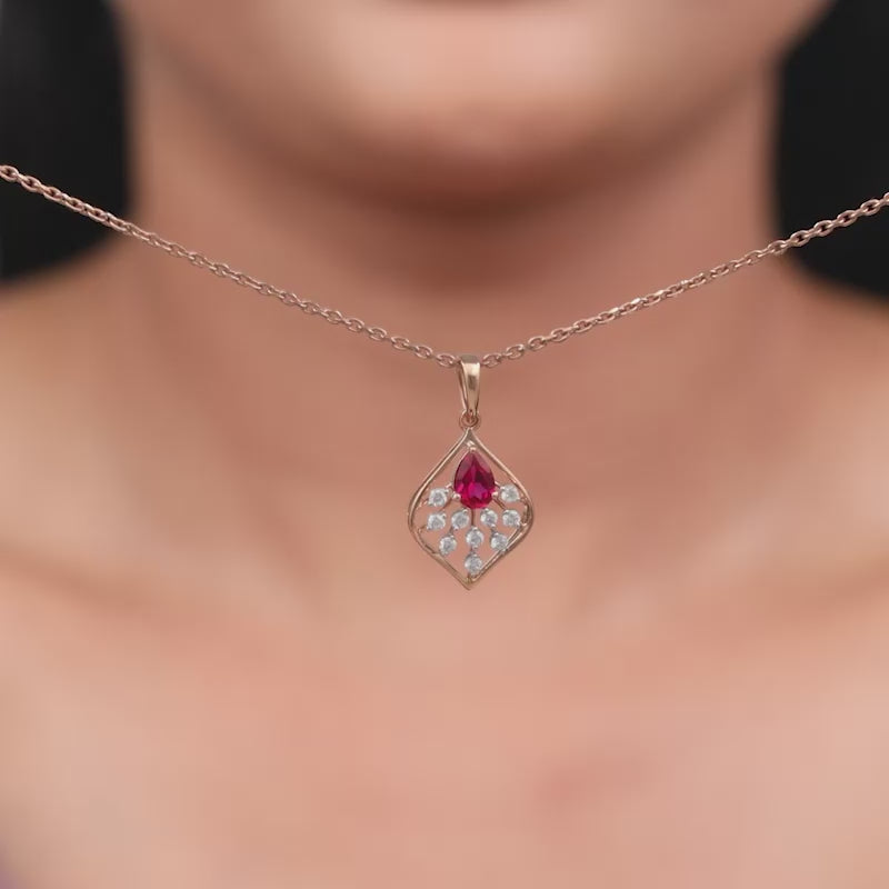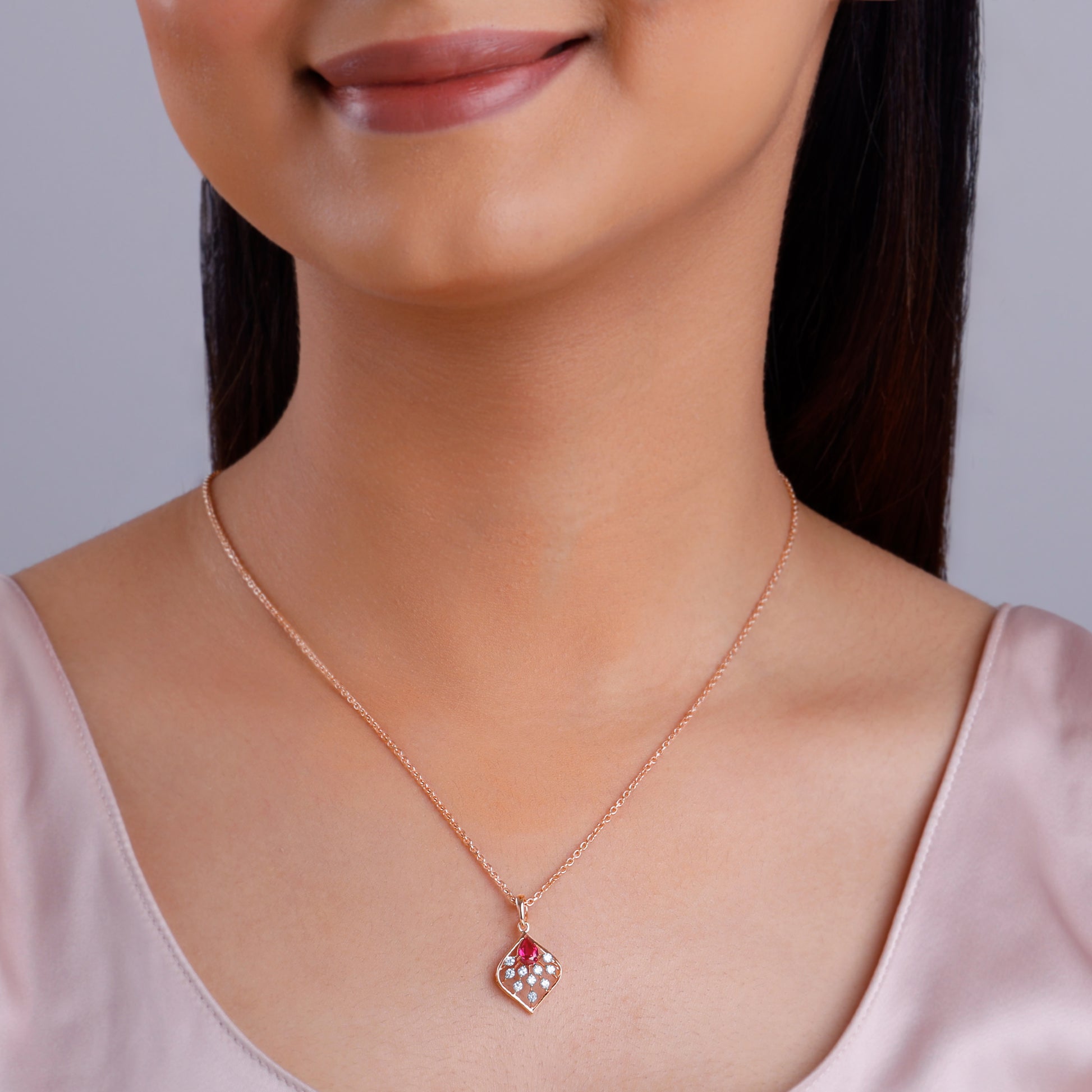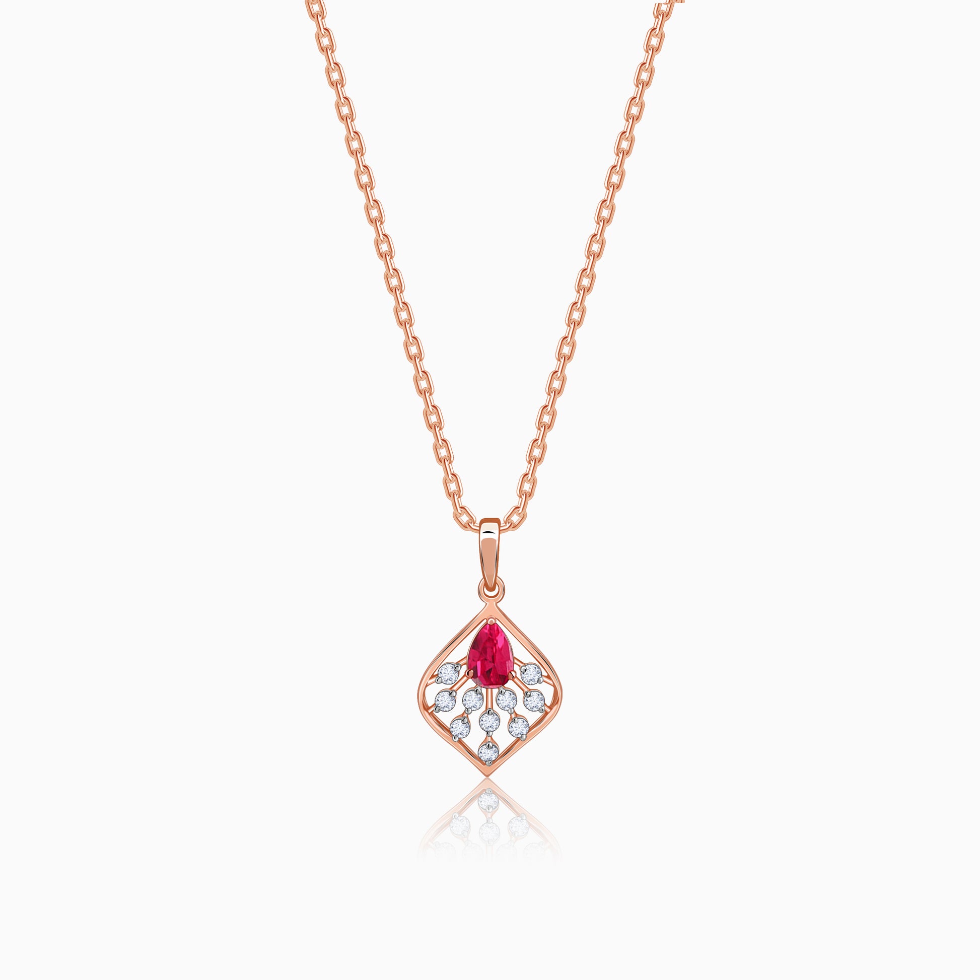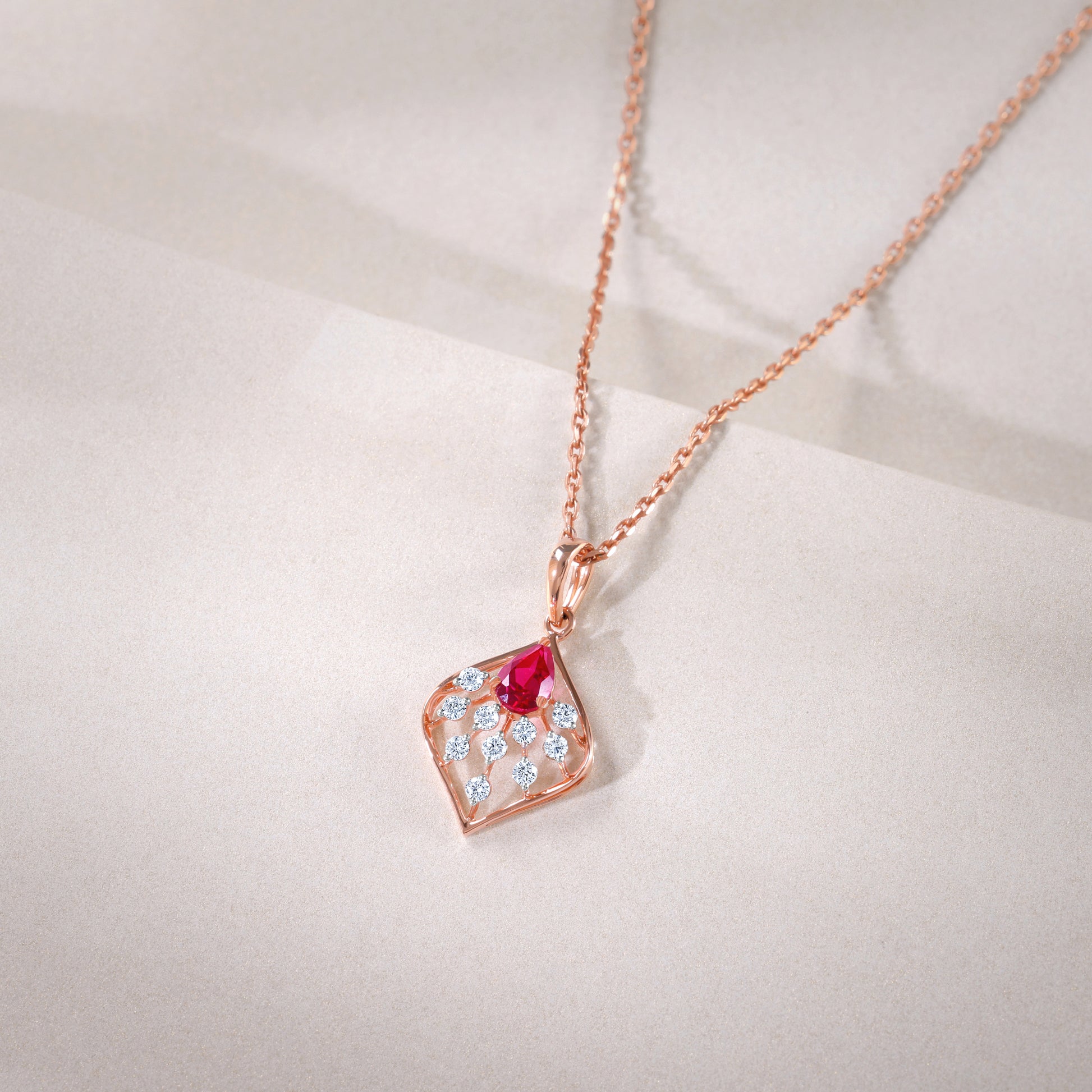 This rose gold pendant for women features a ruby lab diamond at the centre. White lab diamond brings the brilliance in a gold dew drop band.