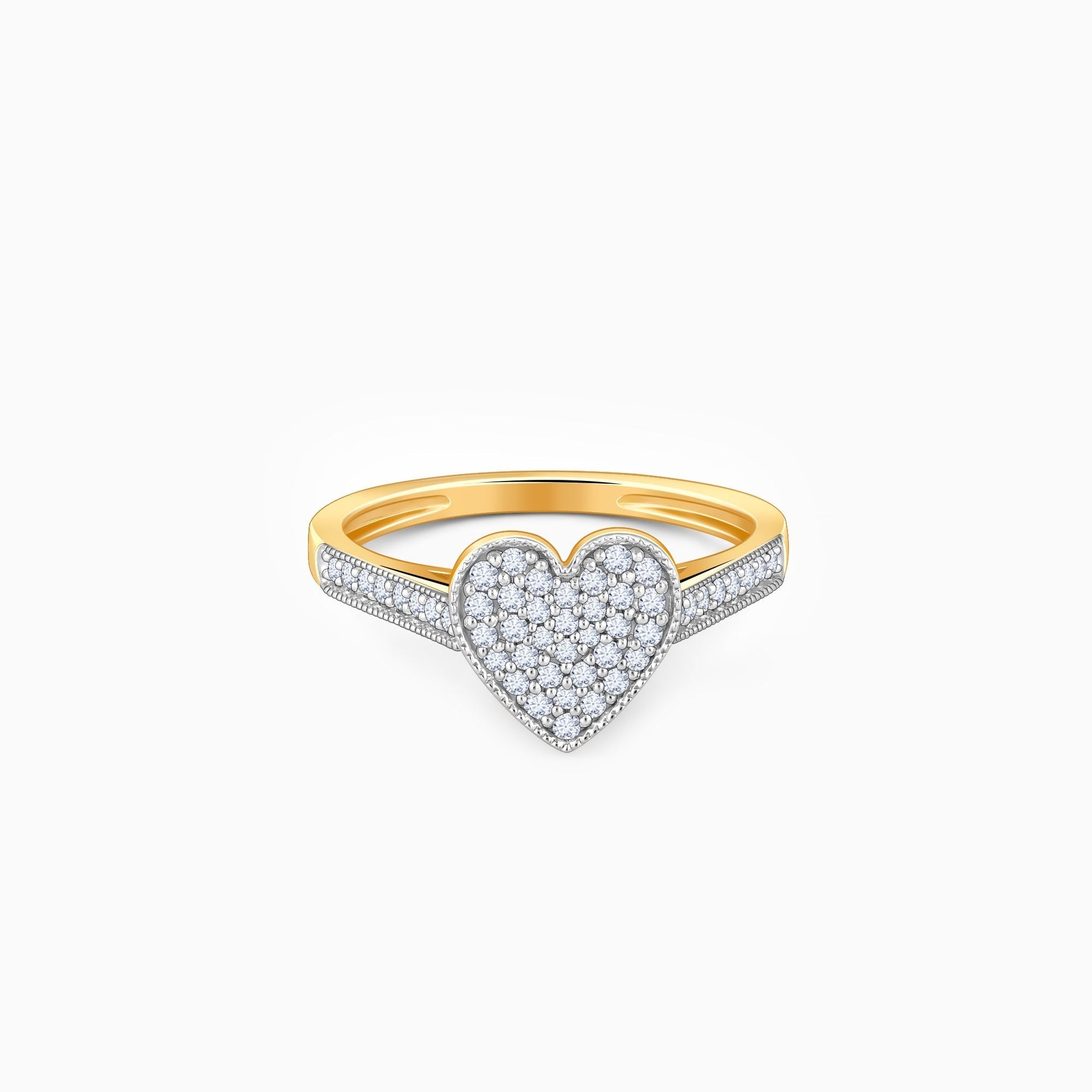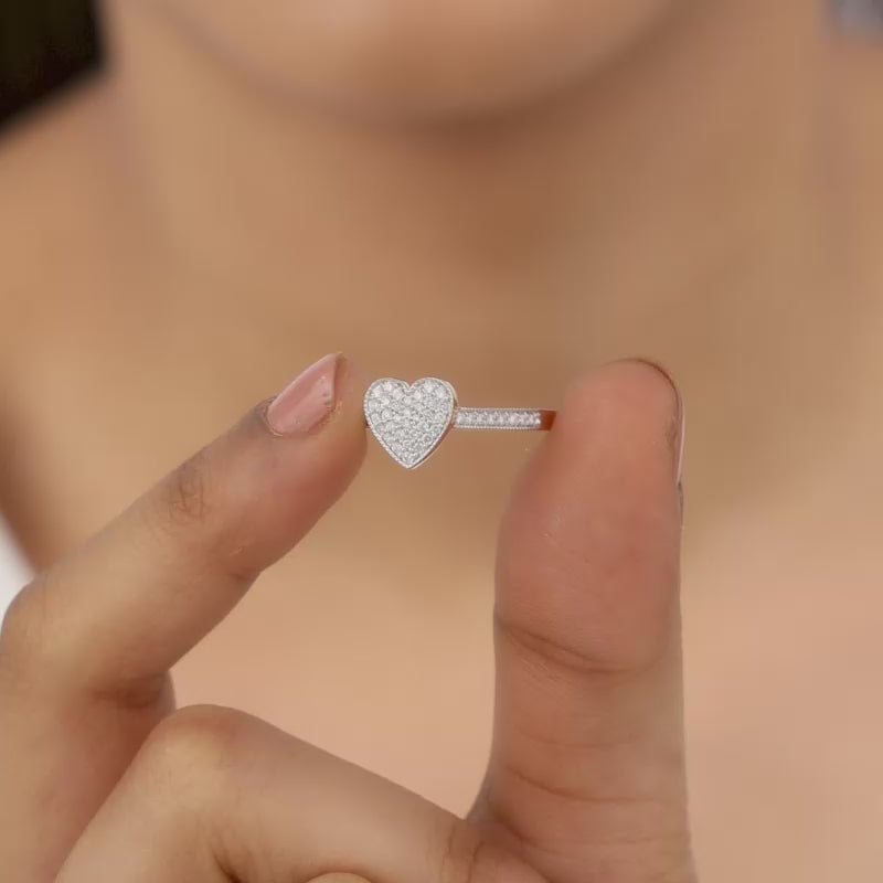 This gold ring has a heart-shaped motif which is covered with lab diamonds.