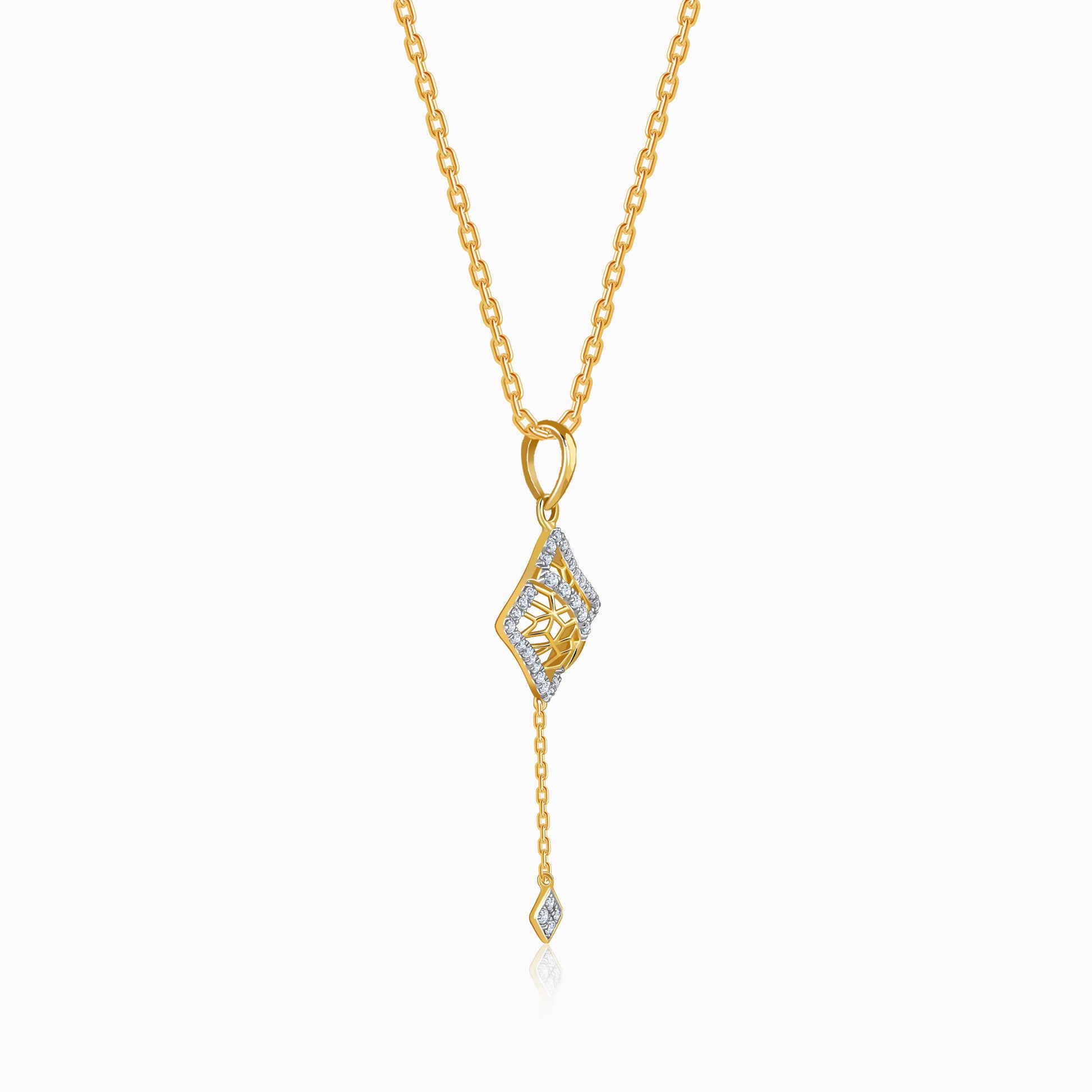 Inspired by clean geometry and fluid movement, this rhombus-shaped gold pendant is designed to draw the eye downward in a graceful cascade. Lab grown diamonds trace the form and flow seamlessly to the tip, creating a sense of motion and light. Try the exquisite lab grown diamond jewellery from Heer By GIVA today.