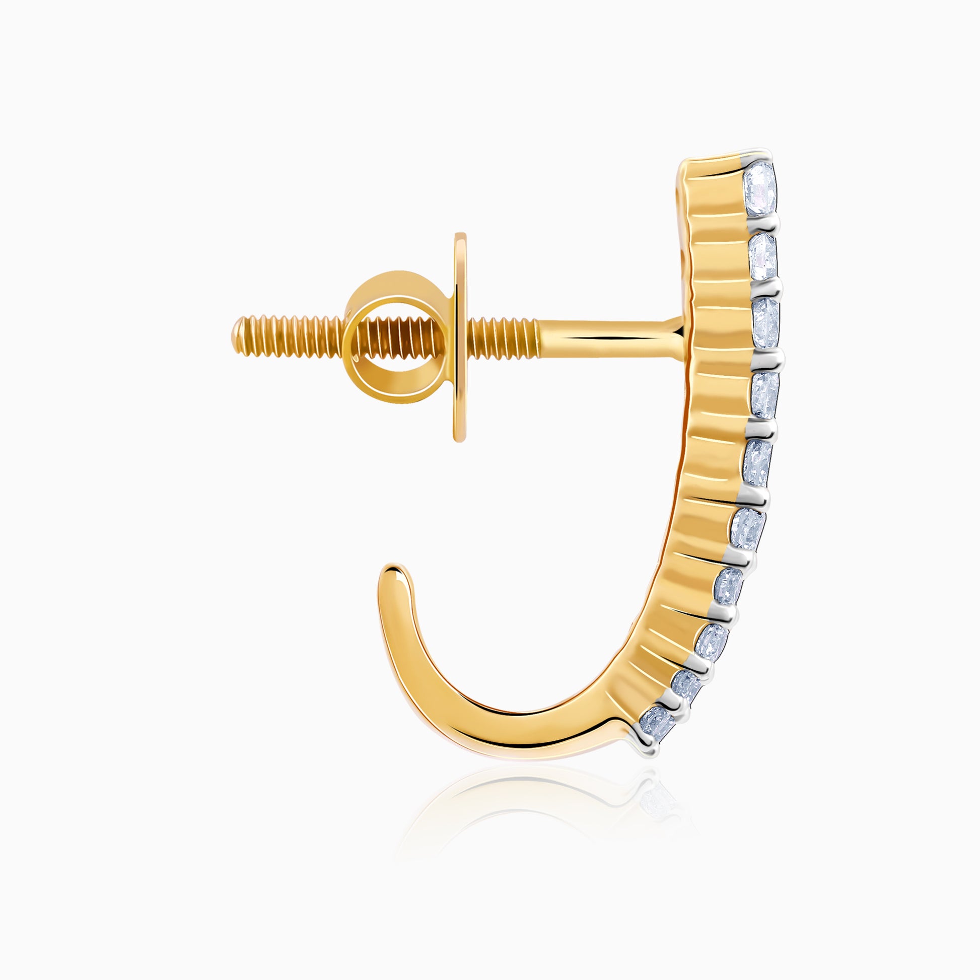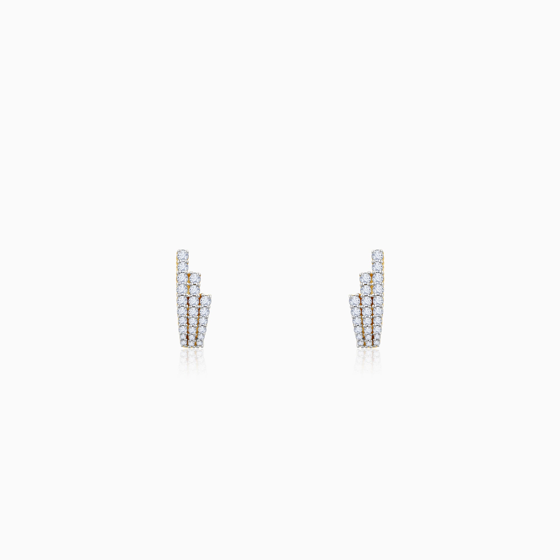 These womens pure gold J-hoop earrings feature three vertical rows of lab grown diamonds in a pave setting.
