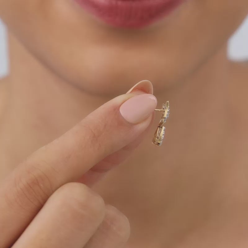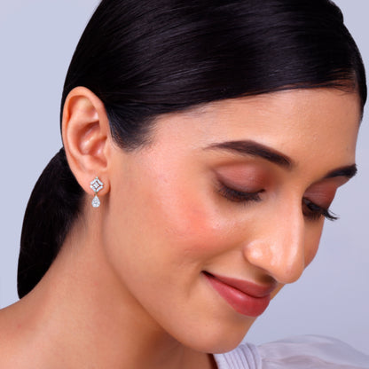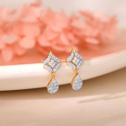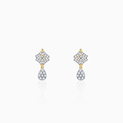 These pure gold earrings feature a unique geometric design with a sparkling lab-grown diamond cluster. The diamond-studded square motif is elegantly paired with a dazzling pear-shaped diamond drop.