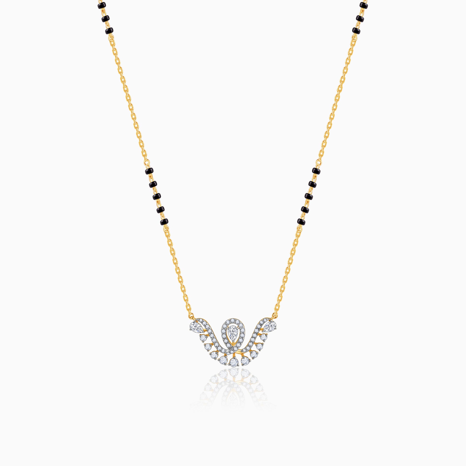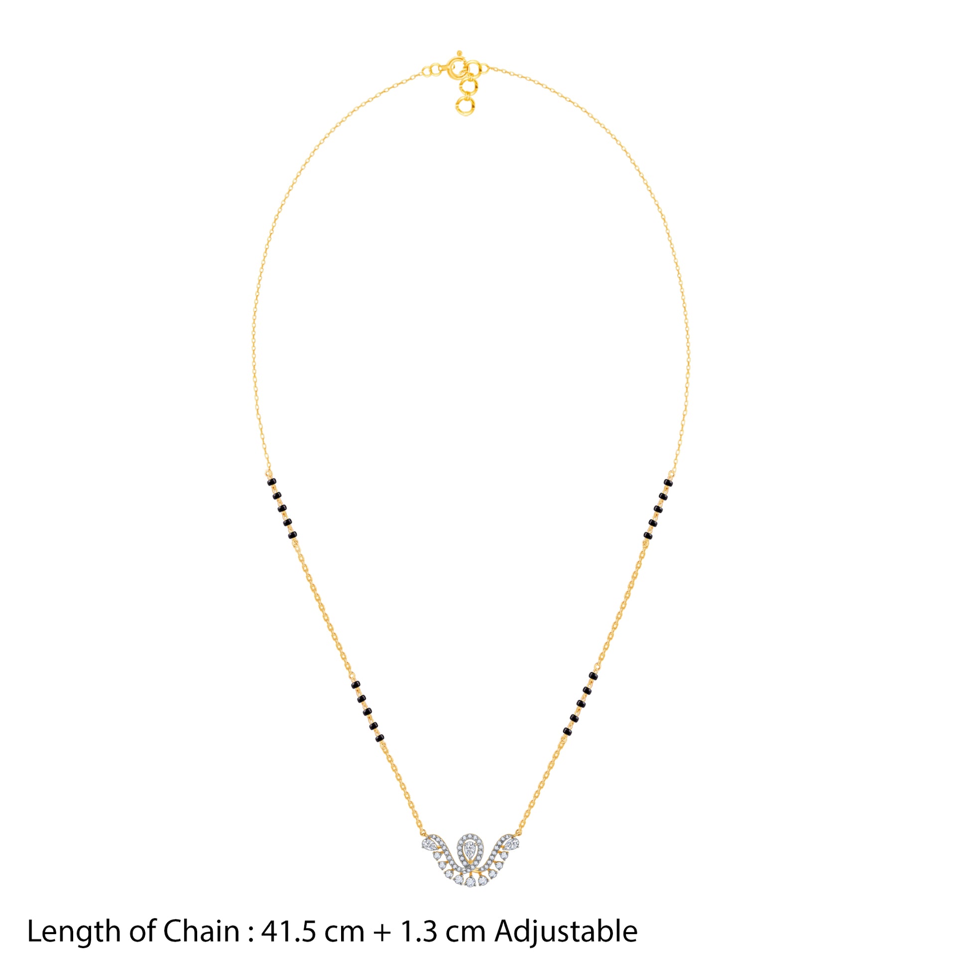 This pure gold mangalsutra for women features a gold chain set with black beads and a unique design studded with sparkling lab grown diamonds.