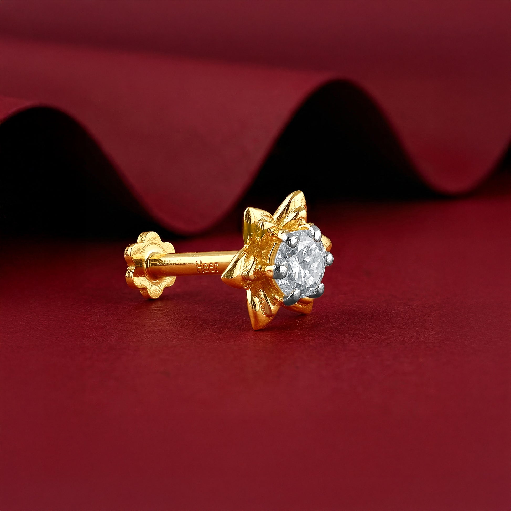Evoking timeless blooms, this gold Nose Pin captures a sculpted flower lit by a sparkling lab grown diamond. Its clean lines and centred brilliance create a quiet yet radiant statement. Try the exquisite lab grown diamond jewellery from Heer By GIVA today.