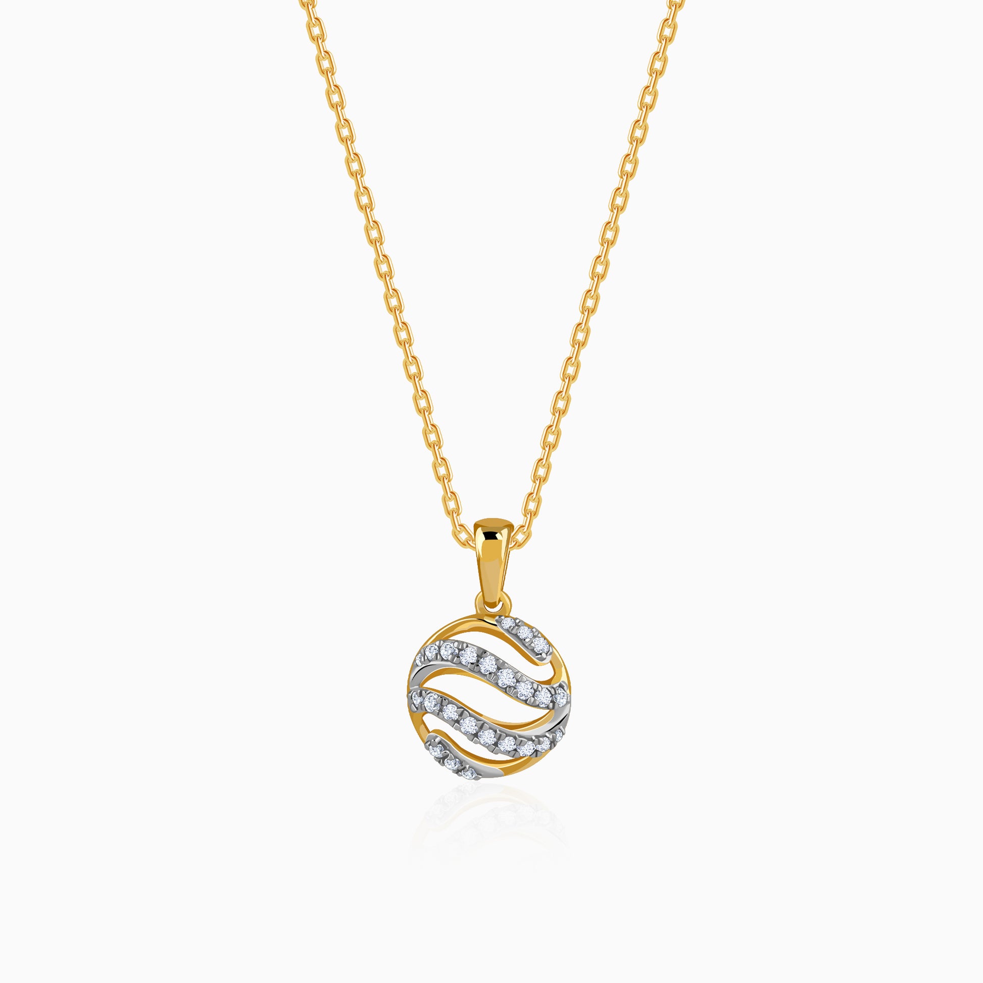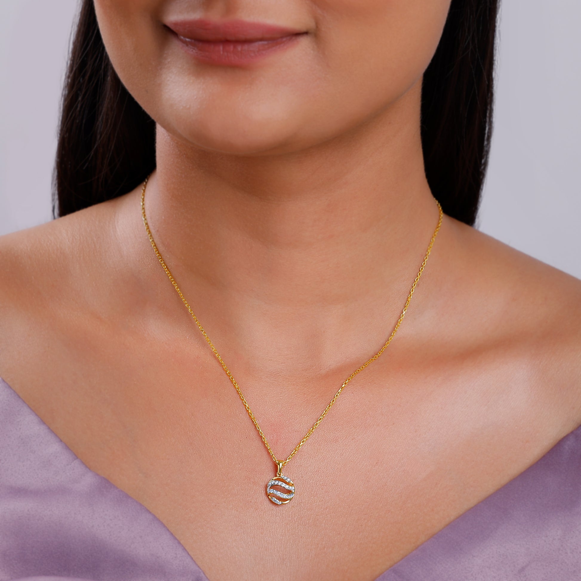 Let this circular gold pendant be a soft reminder that life rarely moves in straight lines, its beauty lies in its twists, turns, and gentle evolutions. The swirling pattern of lab grown diamonds mirrors her journey. Try the exquisite lab grown diamond jewellery from Heer By GIVA today.