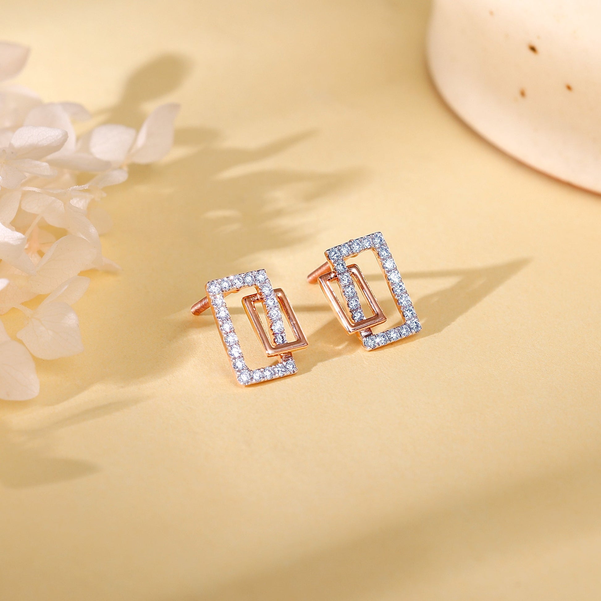 These gold earrings feature a dual rectangular motif, one studded with lab-grown diamonds.