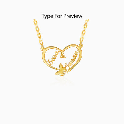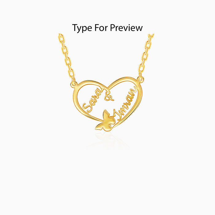 This custom-made golden pendant features two names enclosed in a heart shape and with a butterfly motif at the bottom.