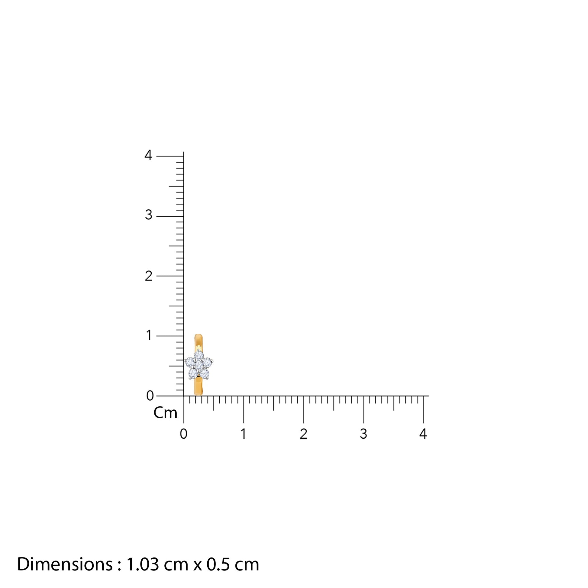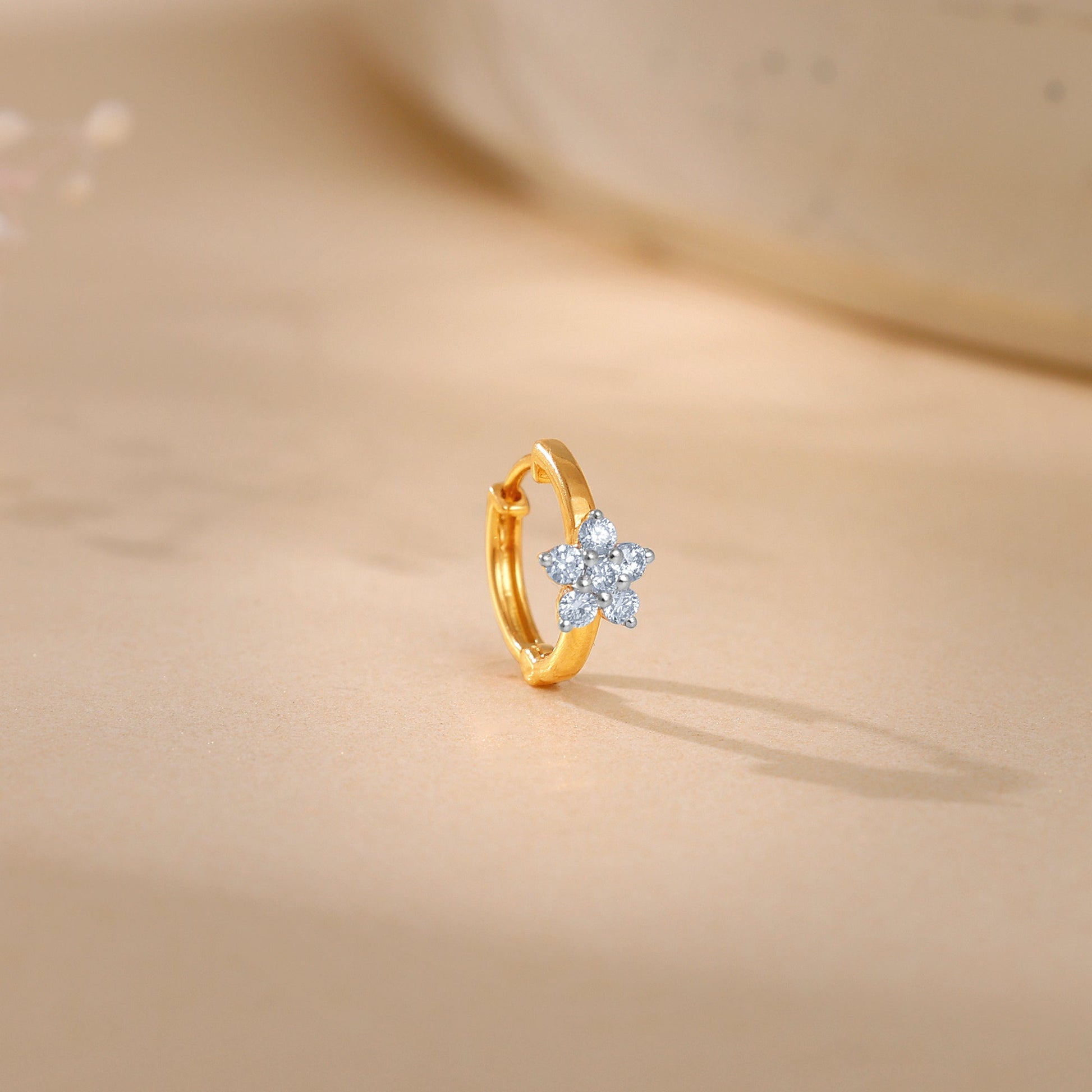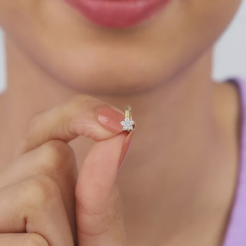 This gold nose ring features a flower motif that is studded with lab-grown diamonds.