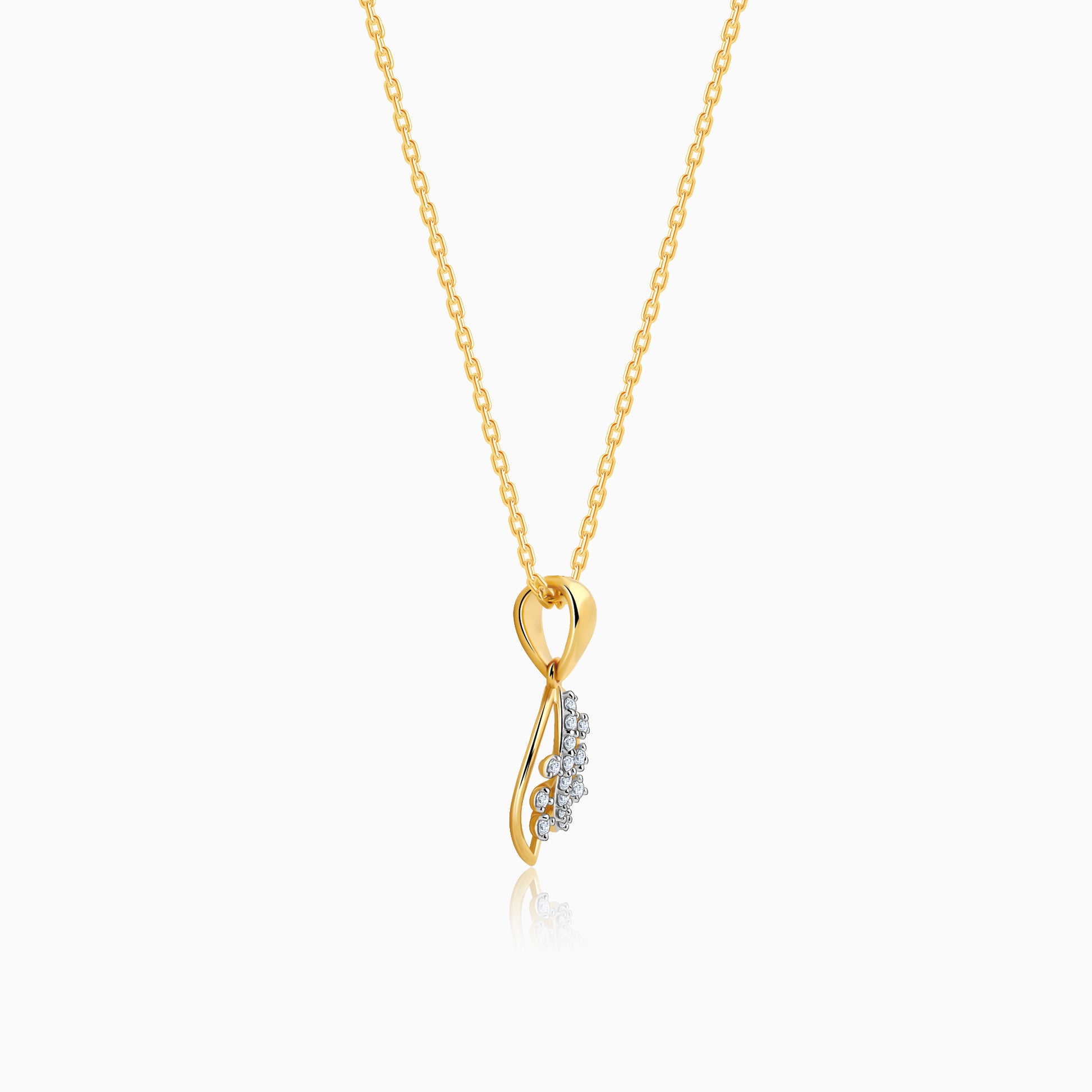 This gold pendant features a dual-leaf motif adorned with lab-grown diamonds.