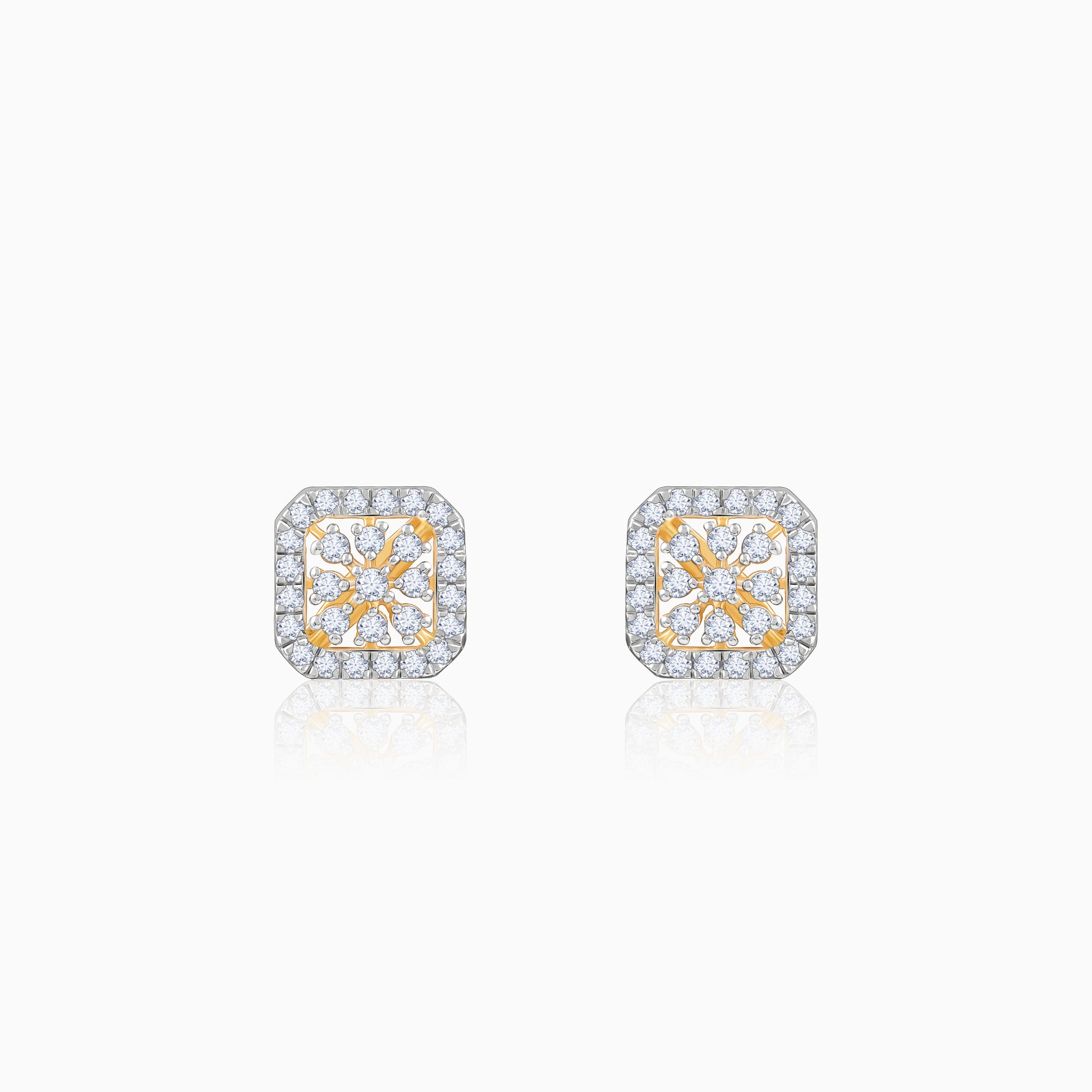 These pure gold earrings for women feature a central cluster of lab diamonds in a floral shape, bordered by a ring of baguette-cut lab grown diamonds.