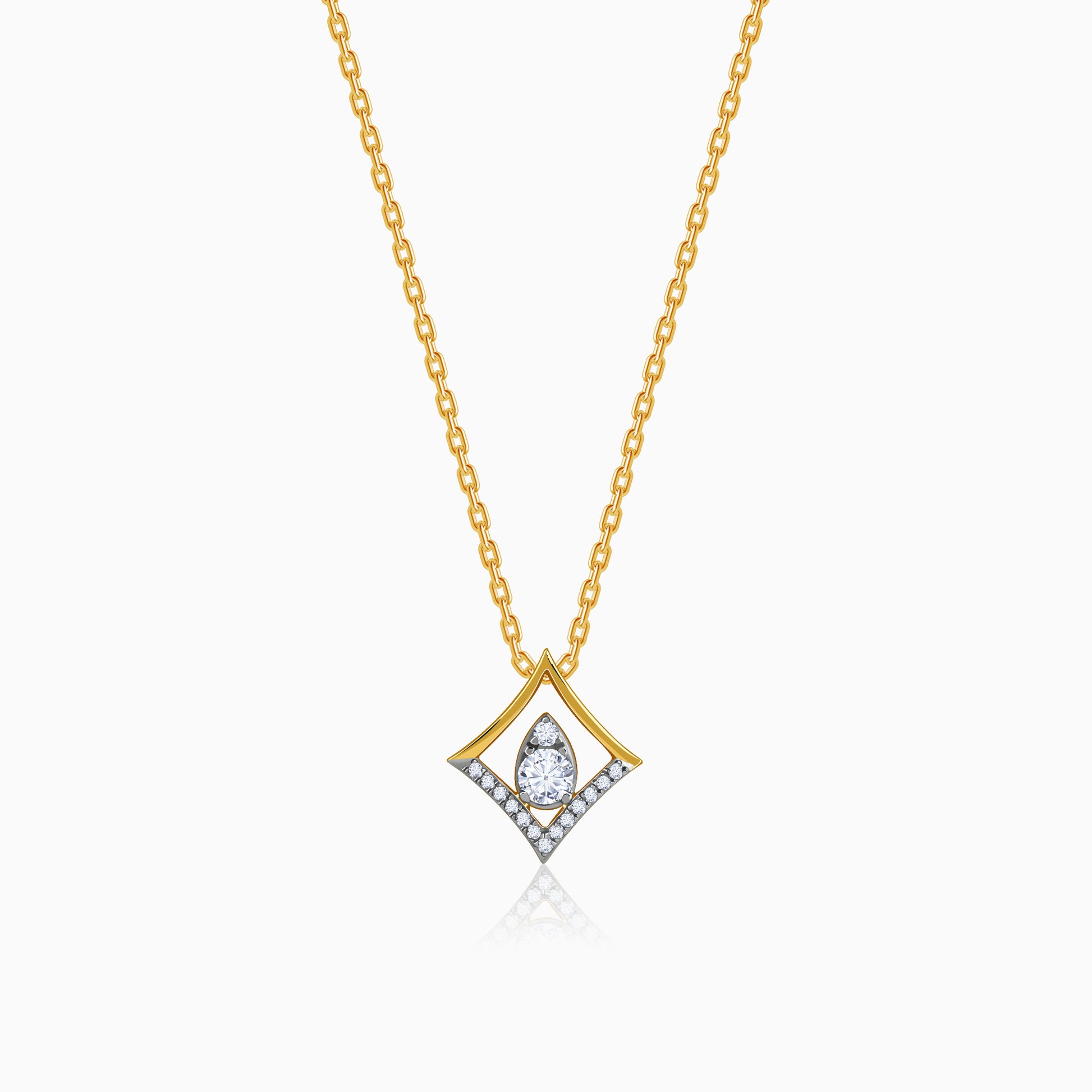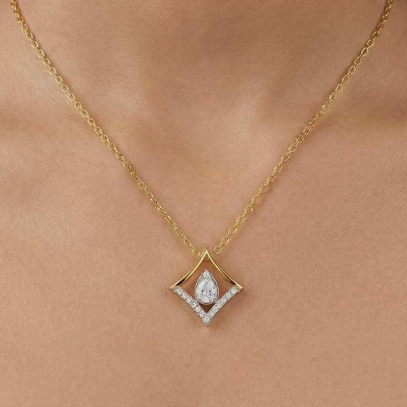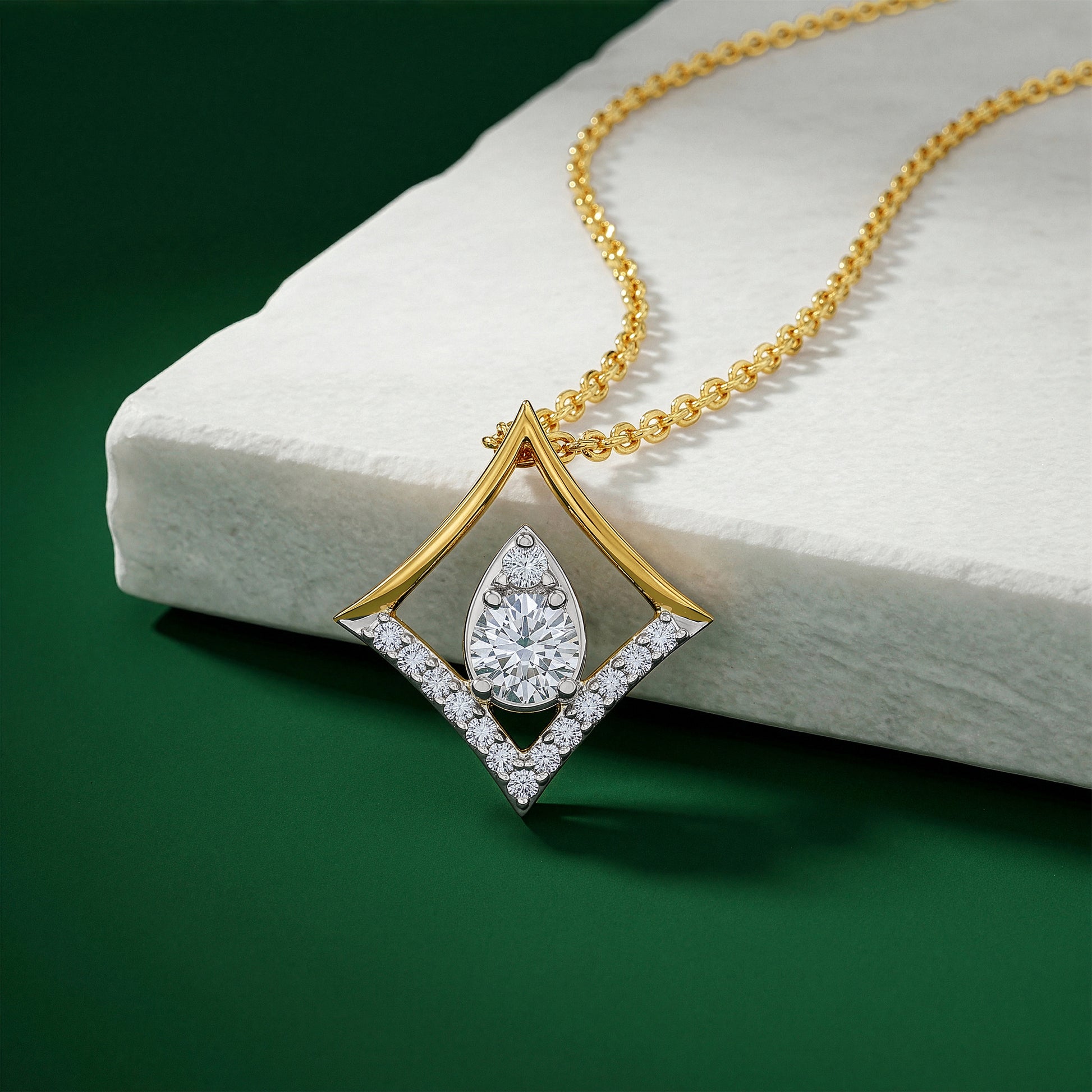 Designed for the woman who enjoys bold geometry with a refined edge, this gold pendant features a striking rhombus silhouette. A polished gold section contrasts with lab grown diamonds, while a pear shaped lab grown diamond at the centre becomes the focal point. Try the exquisite lab grown diamond jewellery from Heer By GIVA today.