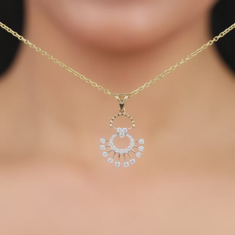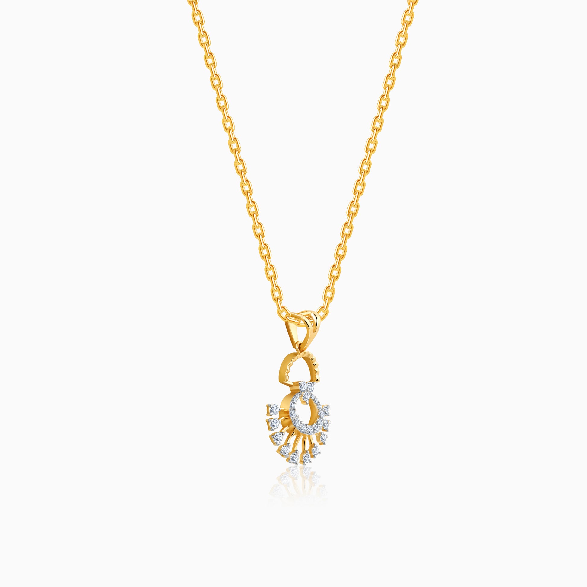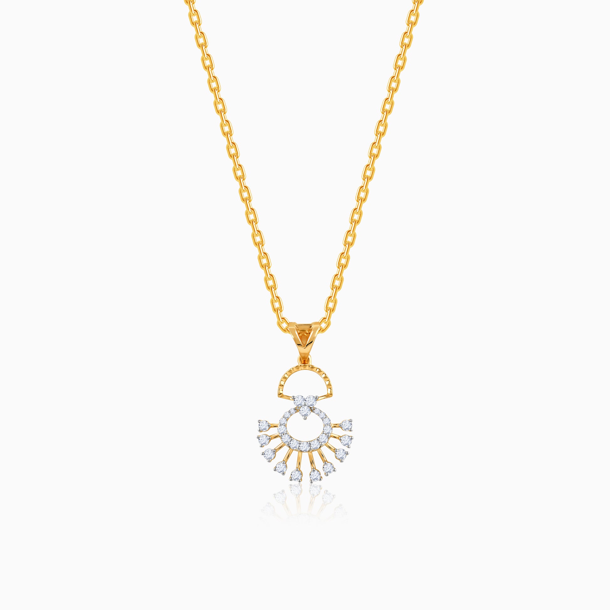 This pure gold pendant for women features a dandelion-like motif studded with lab diamonds hanging from a semi-circle.