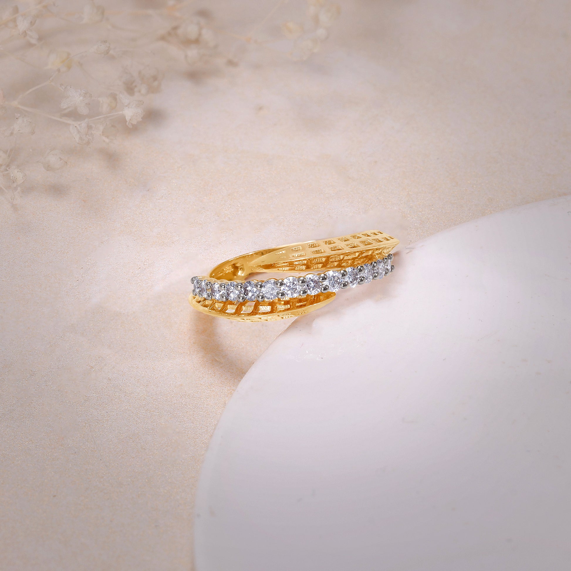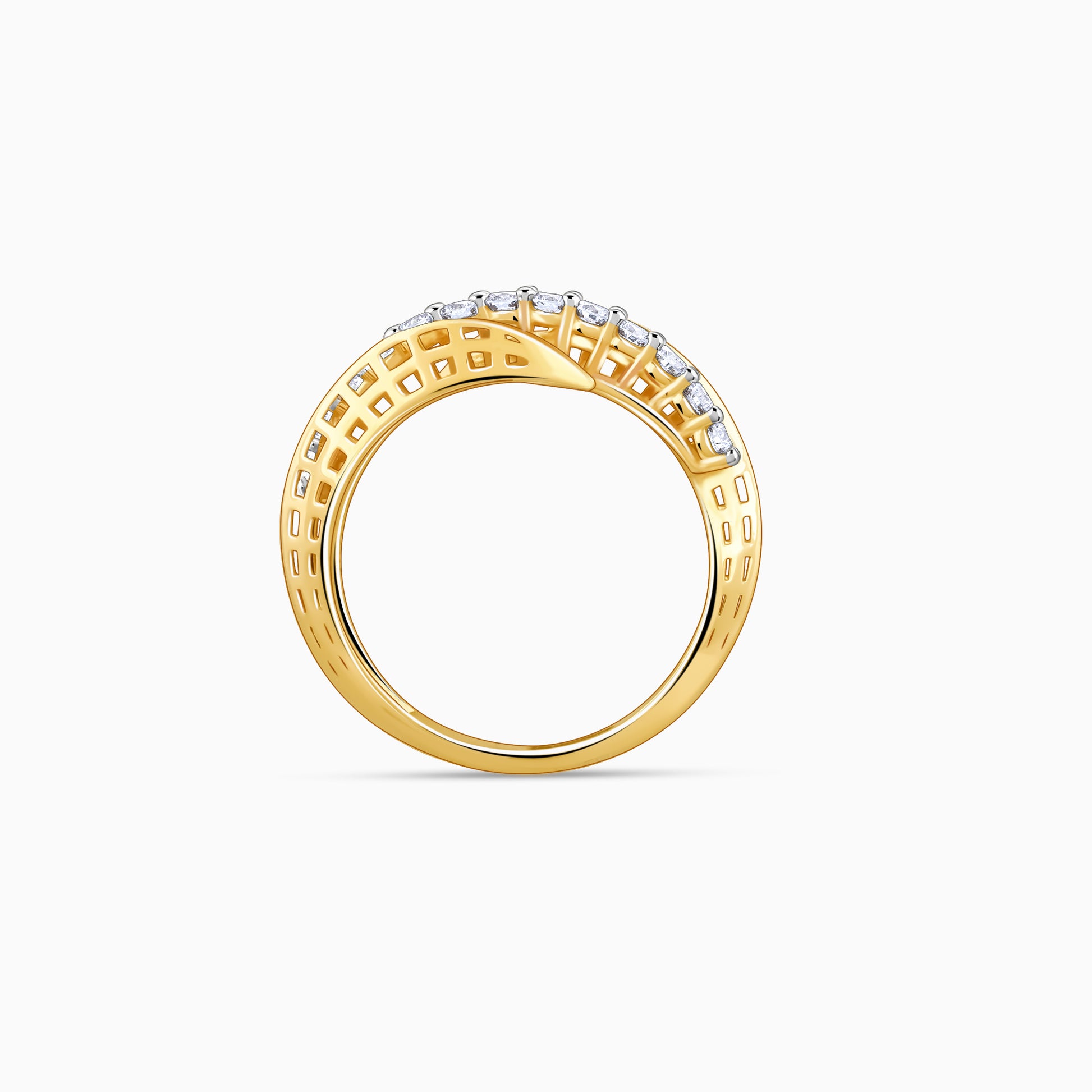 This pure gold diamond ring for women features a split band with an abstract open design. One half of the band features a mesh-like design while the other half of the band features lab grown diamonds in a shared prong setting.