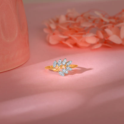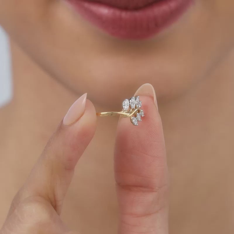 This beautiful ring has a minimal gold band with a leafy branch-like motif, studded with lab-grown diamonds.