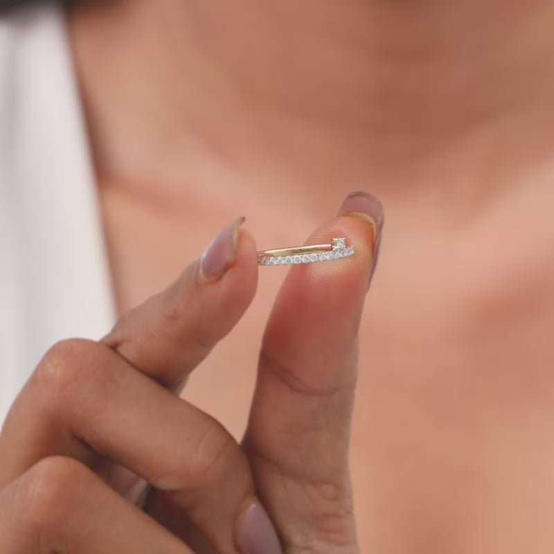 For milestones, memories, and magical moments, this gold ring is the gift that speaks from the heart. This gold ring for women features a sleek band lined with perfectly aligned lab grown diamonds. At the top, a single round lab diamond stands out, adding a focal point. Try the exquisite lab grown diamond jewellery from Heer By GIVA today.