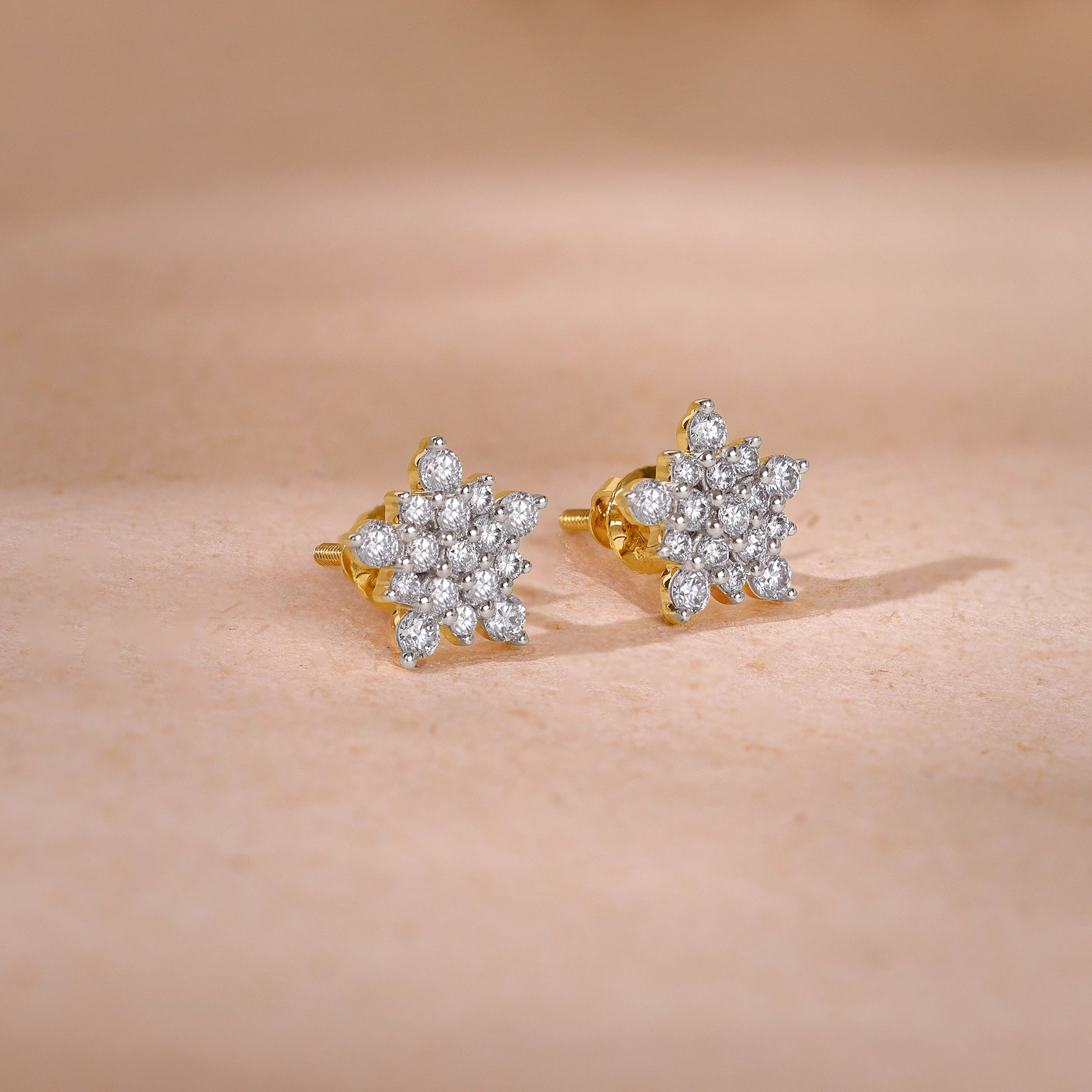 These pure gold earrings are snowflake-shaped with lab grown diamonds, artfully arranged.