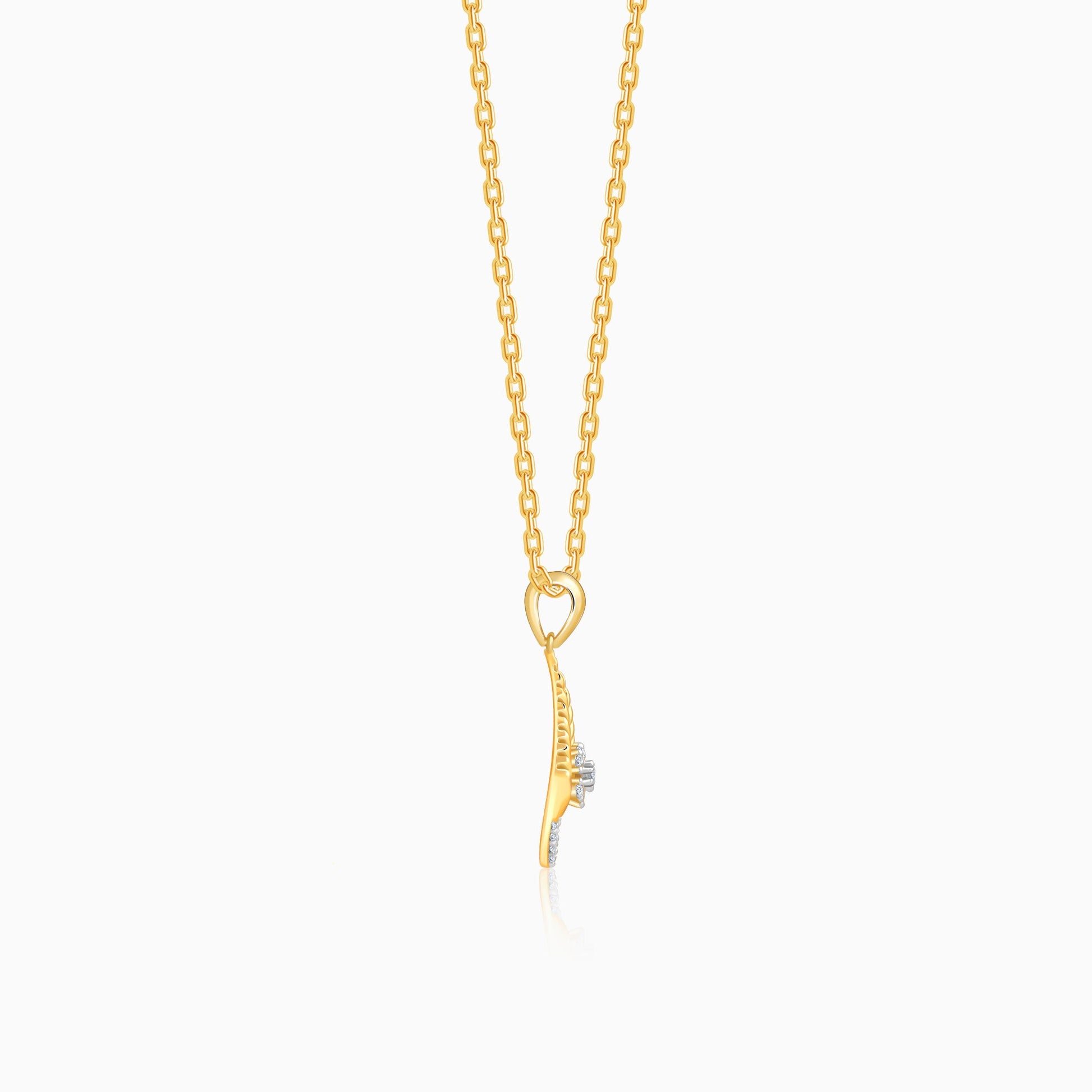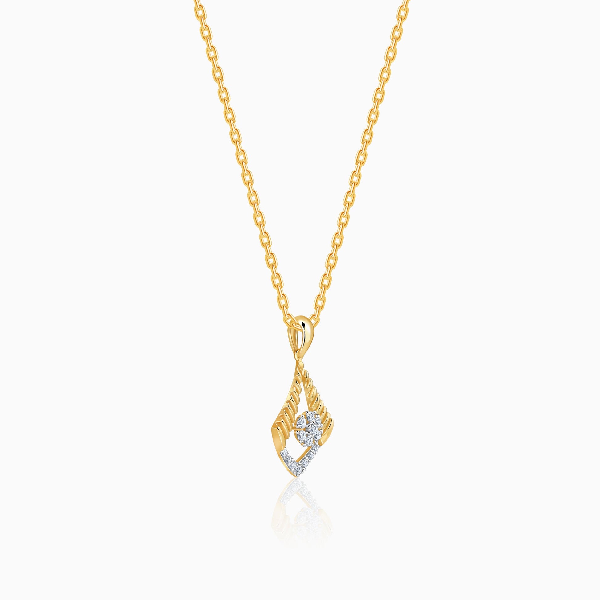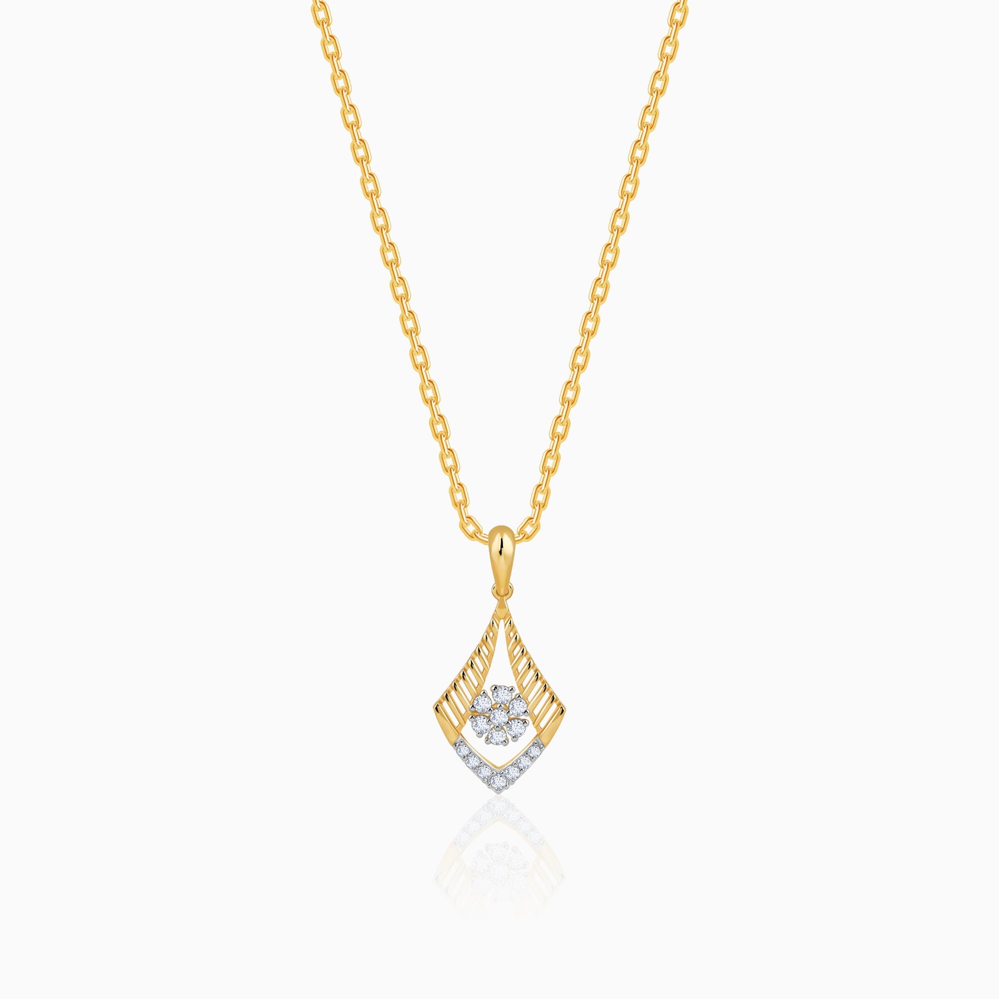 This pure gold pendant for women features a diamond-shaped frame with intricate grooves. The lower section of the frame is partially studded with lab grown diamonds. At the centre, a floral cluster of lab grown diamonds is placed.