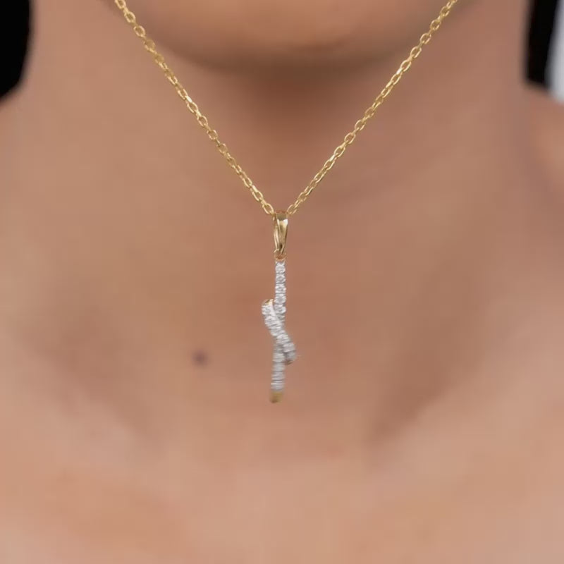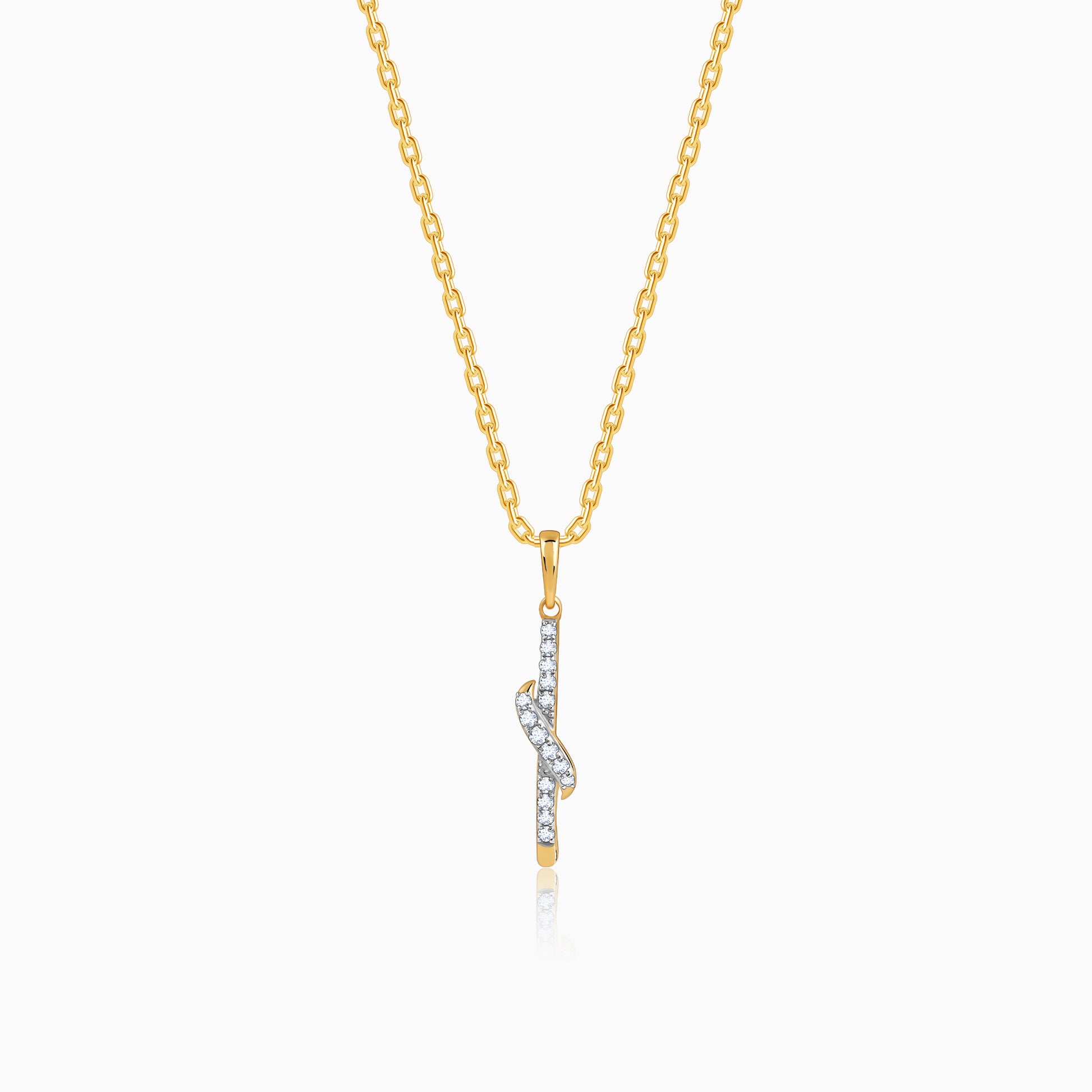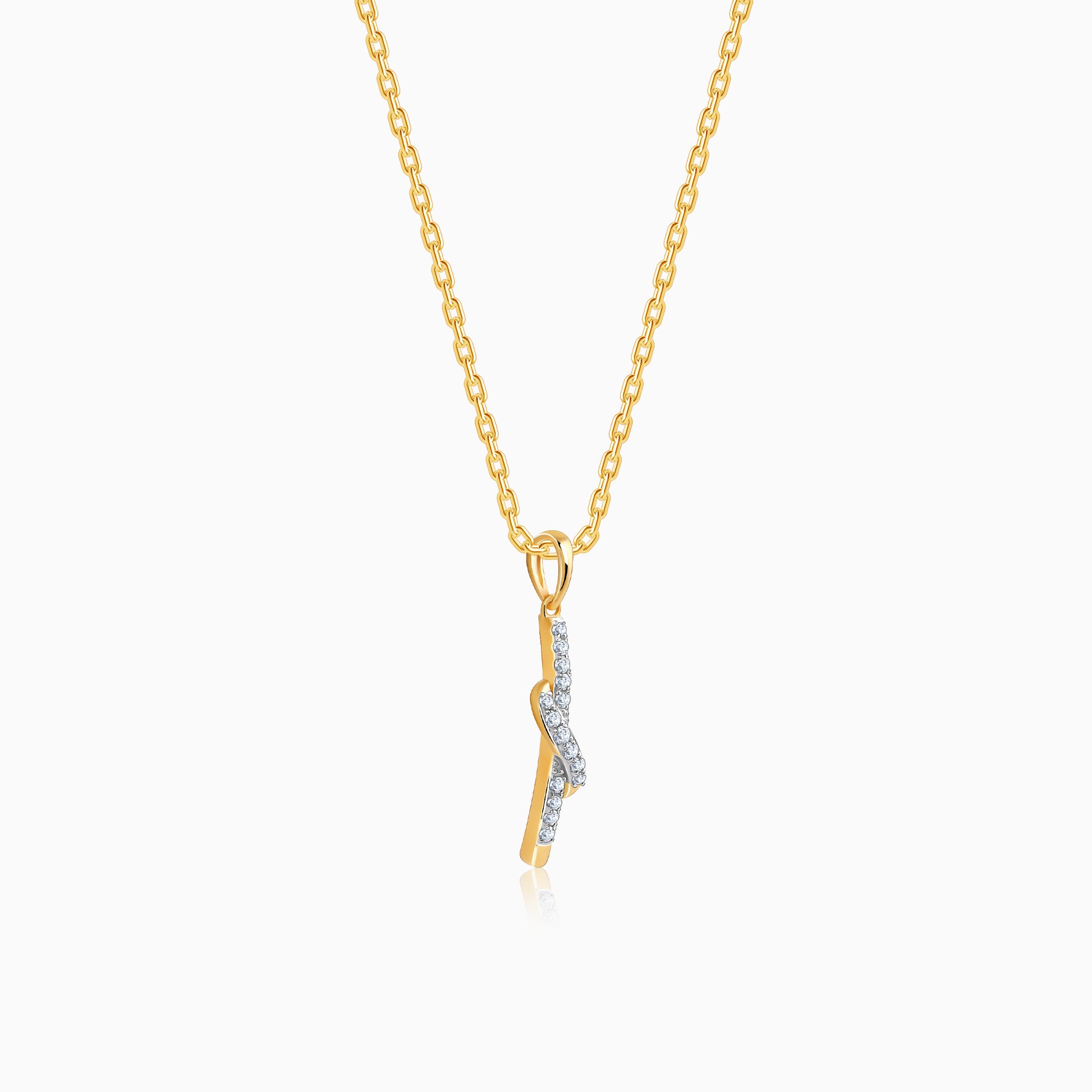 This pure gold pendant for women features a sleek vertical bar studded with lab grown diamonds all over. A twisted motif, also studded with lab diamonds, crosses the bar near the central area.