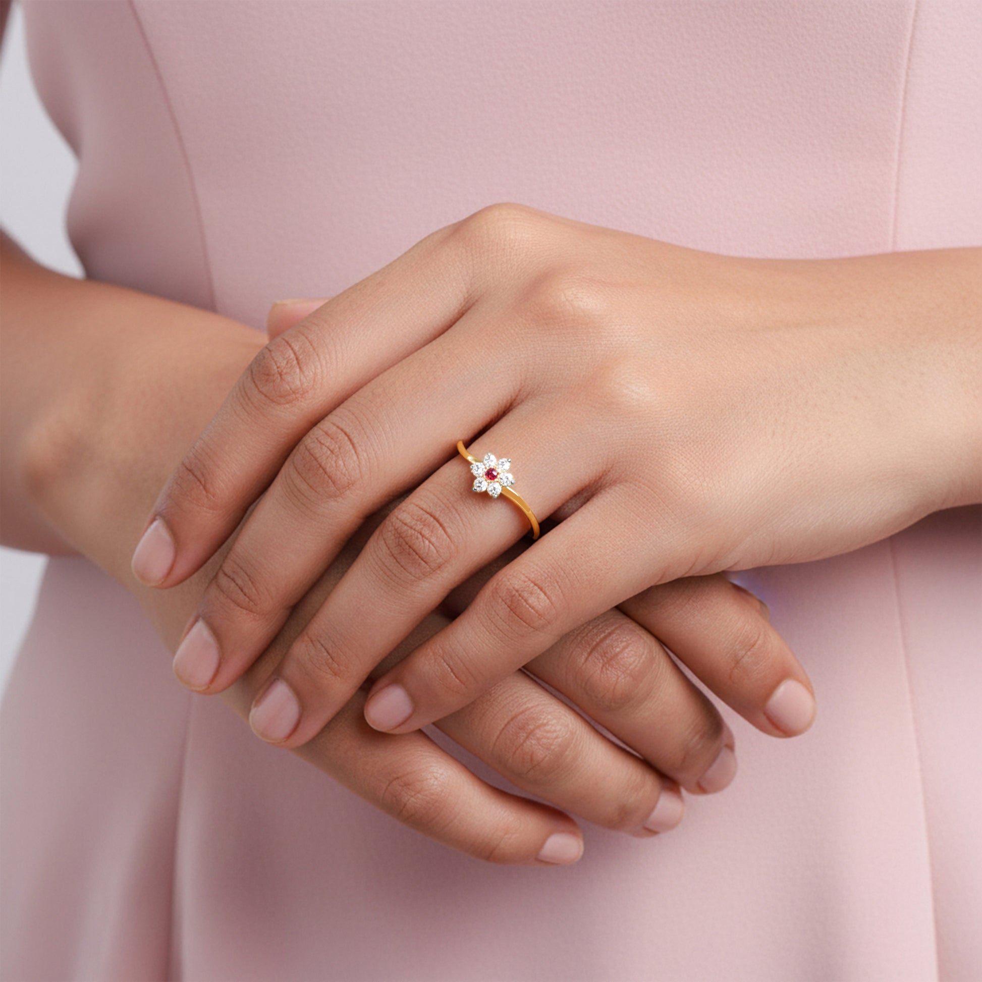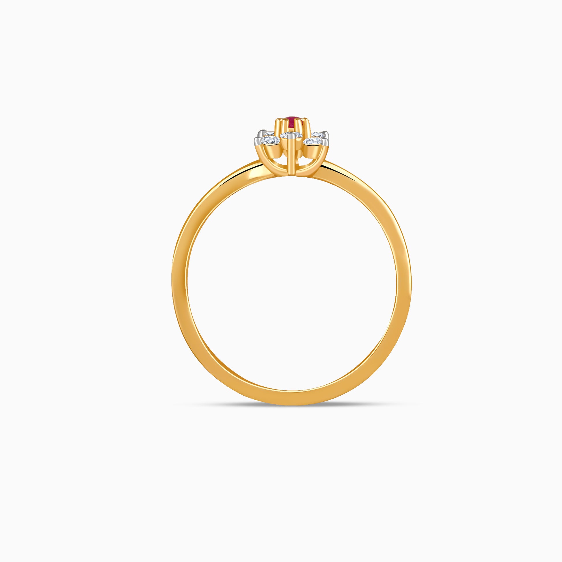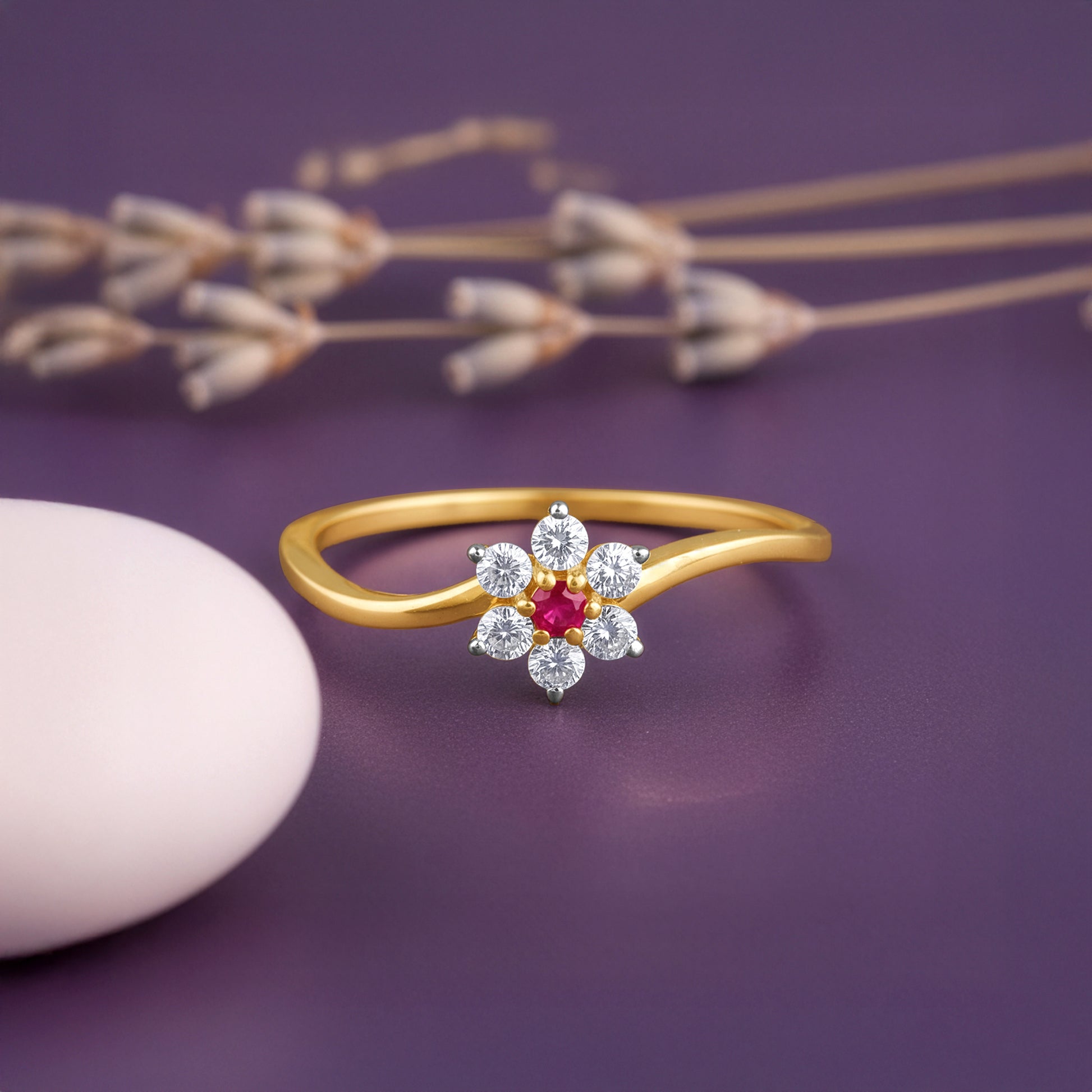 A gold ring where a swirling band leads to a floral motif, each petal studded with lab grown diamonds and crowned with a coloured stone at the centre. Made for the woman whose charm is effortless, it captures light with every movement. Try the exquisite lab grown diamond jewellery from Heer By GIVA today.