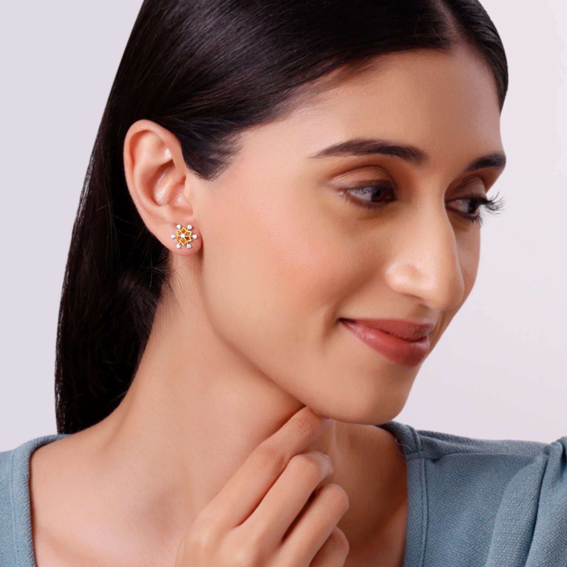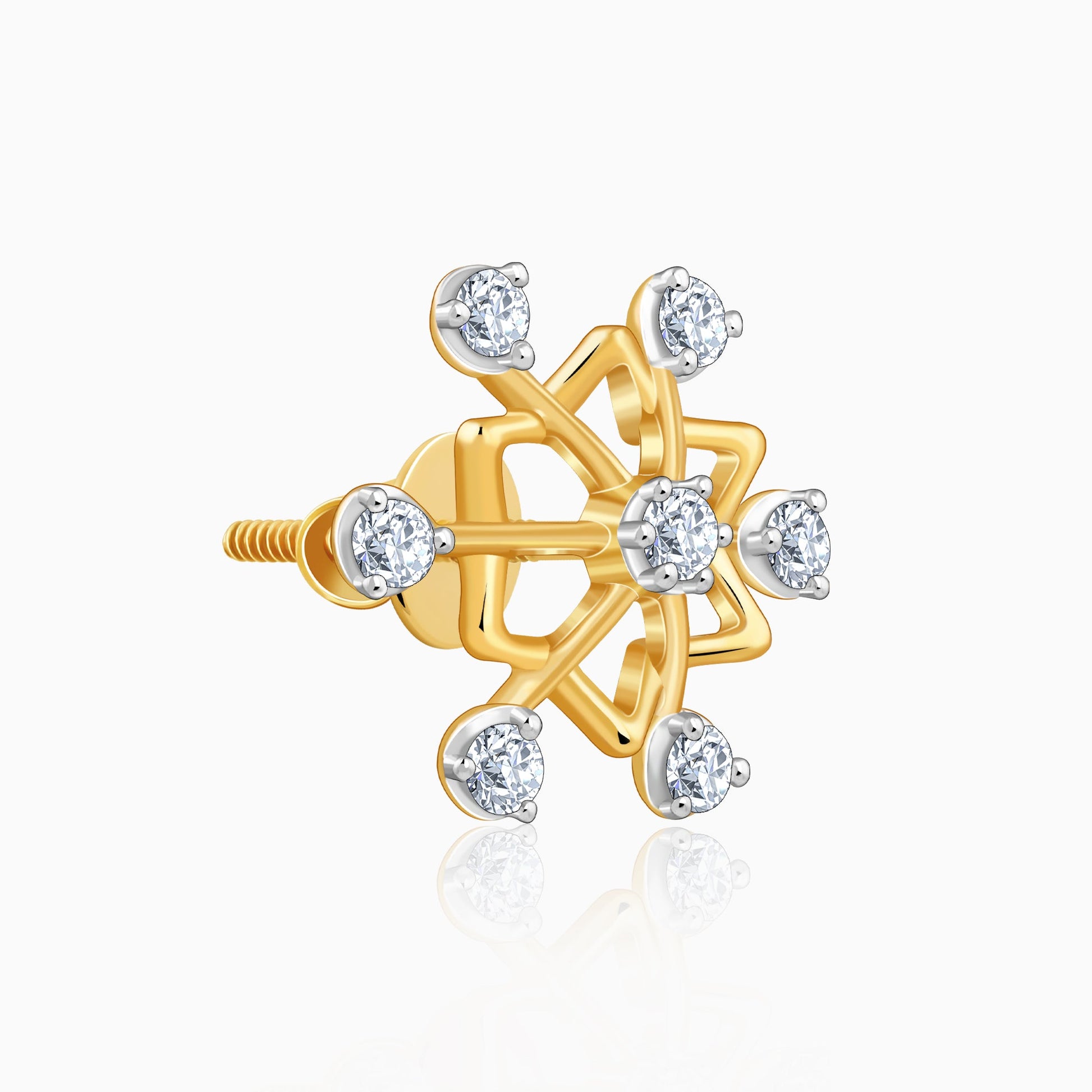 These pure gold earrings for women are crafted in a starburst design. They feature a central lab grown diamond surrounded by six radiating points, each tipped with a smaller lab diamond.