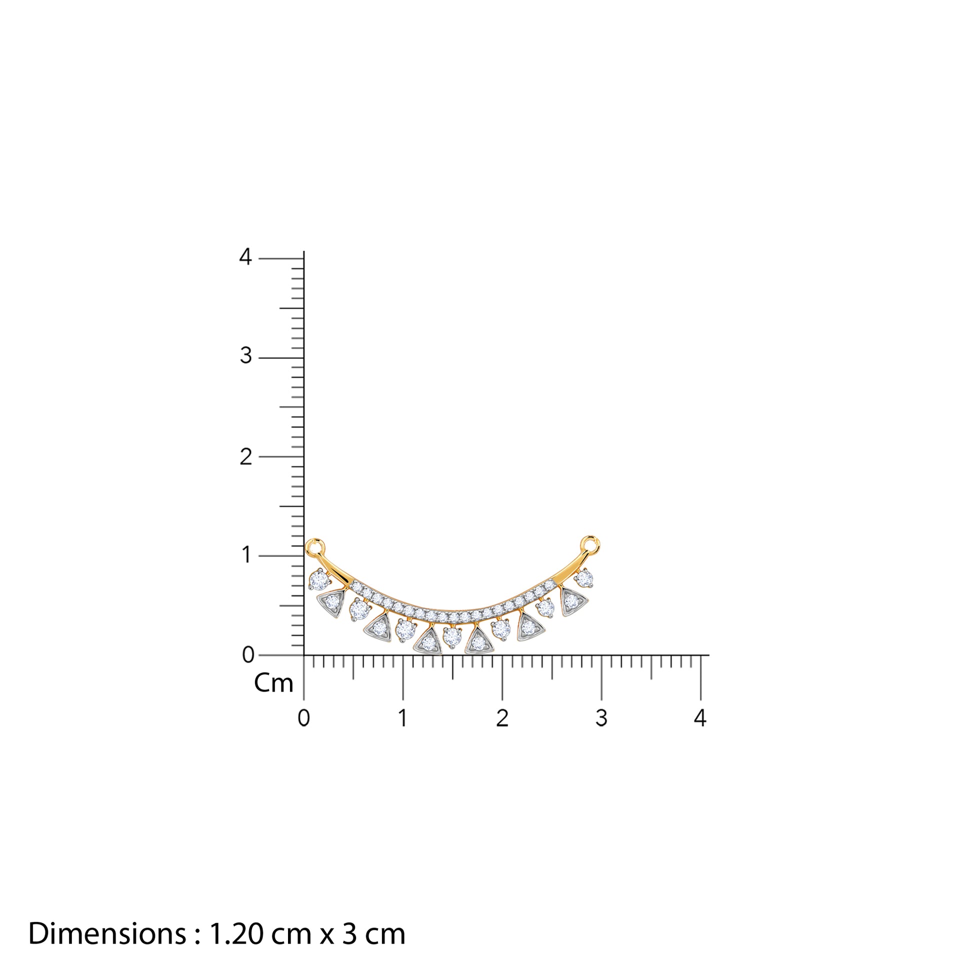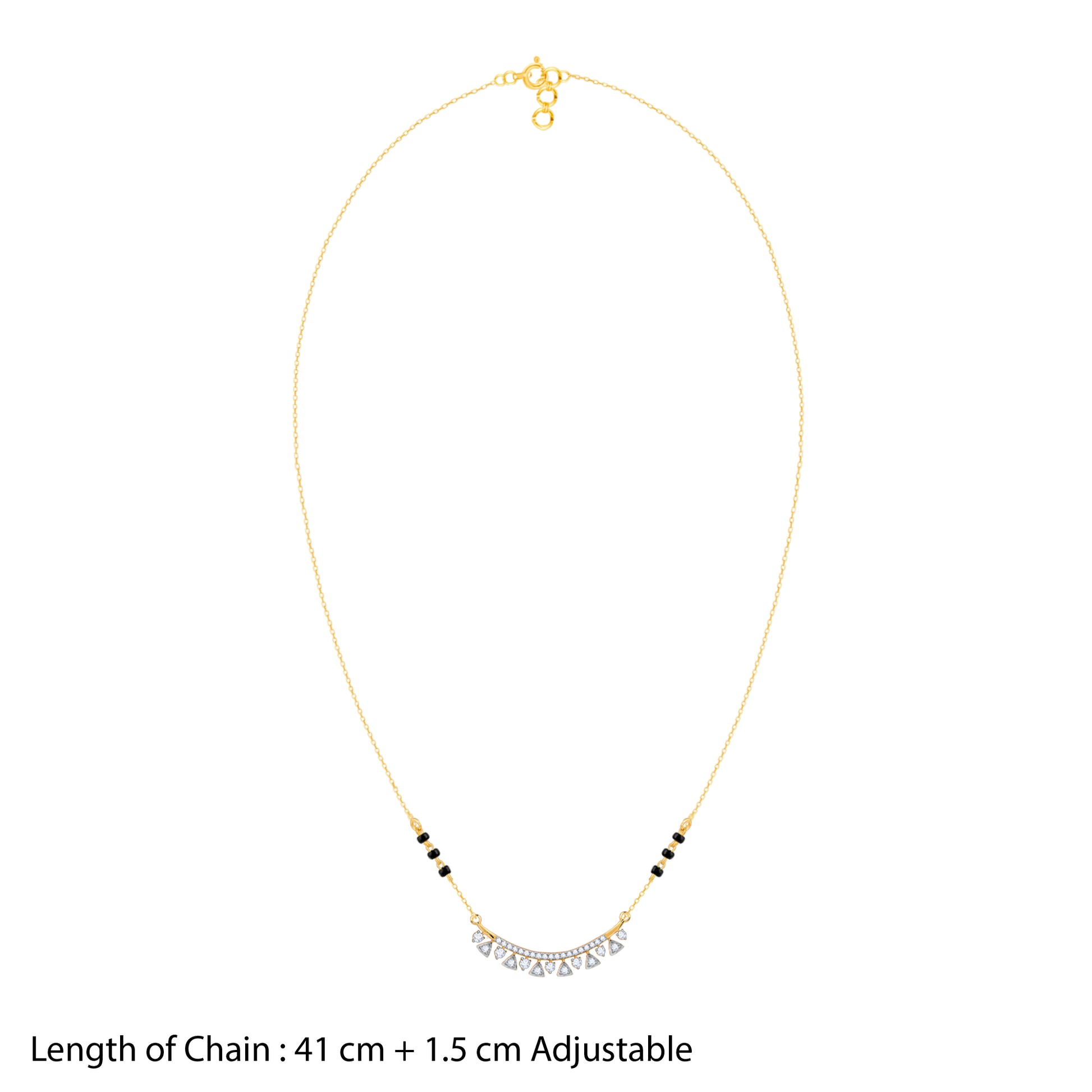 This pure gold mangalsutra for women features a curve with triangular & circiular motifs studded with lab grown diamonds. The gold chain, set with traditional black beads, adds a modern touch.