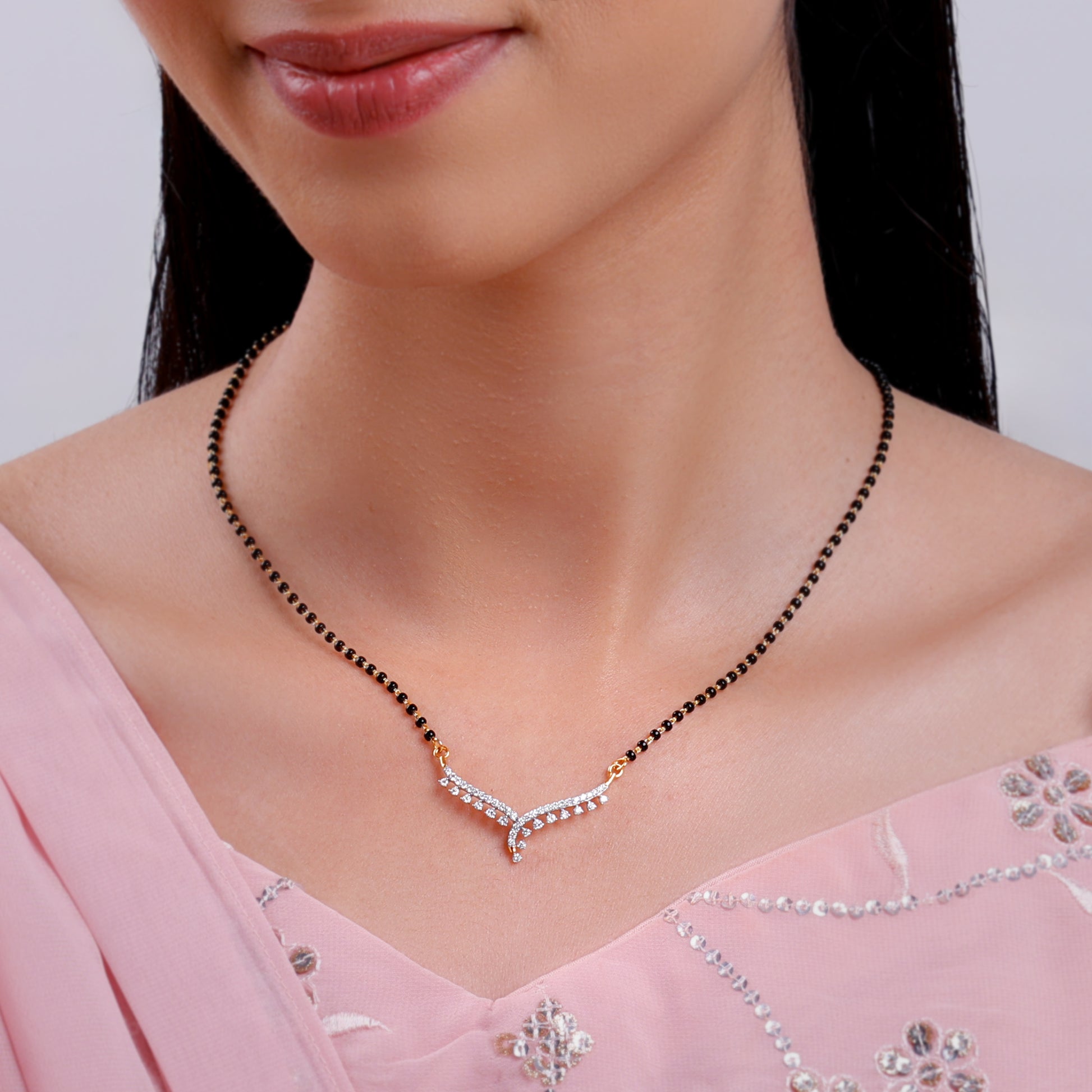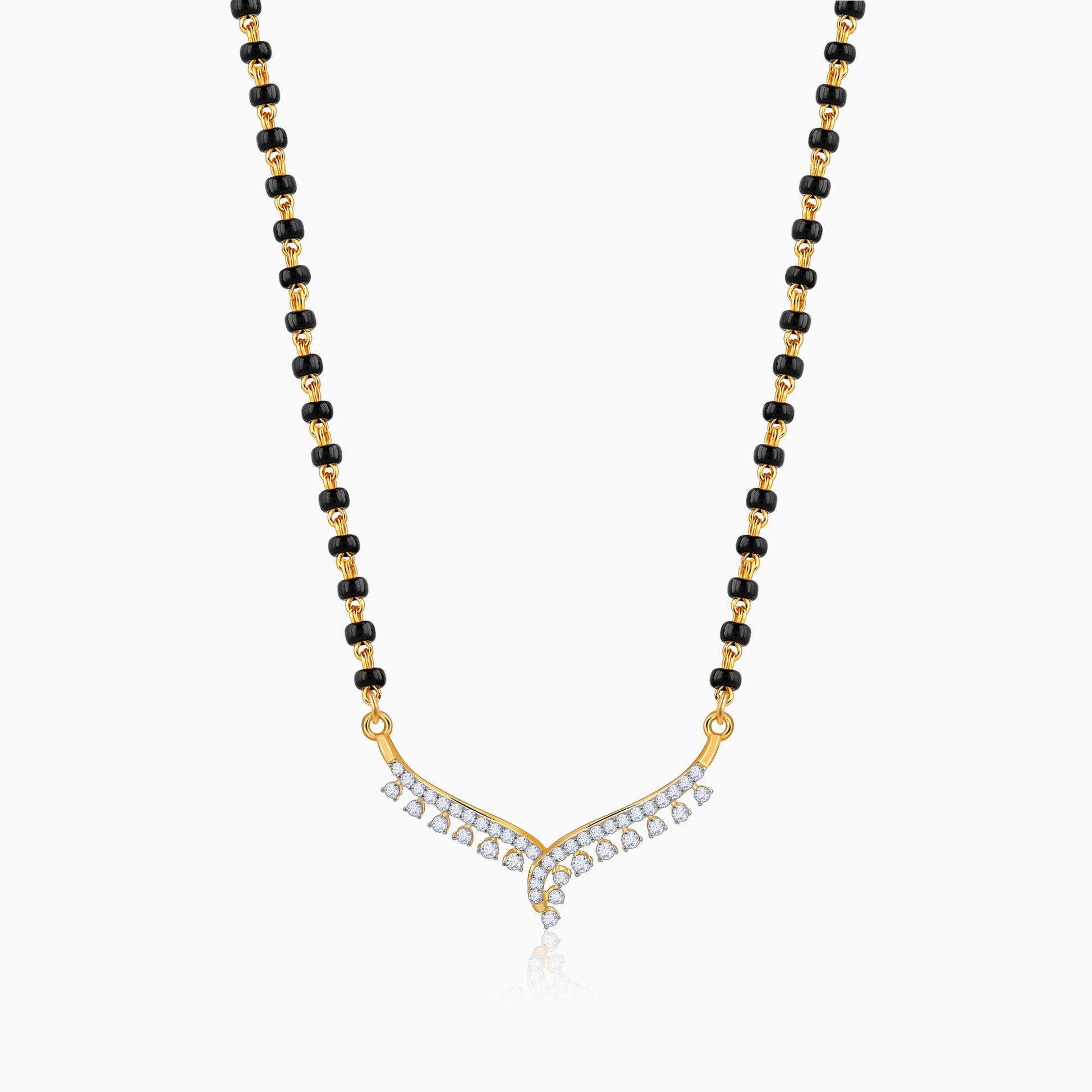 This gold mangalsutra for women features a chain with traditional black beads and a V-shaped design. Twin rows of lab grown diamonds and dangling accents add graceful movement and layered sparkle.