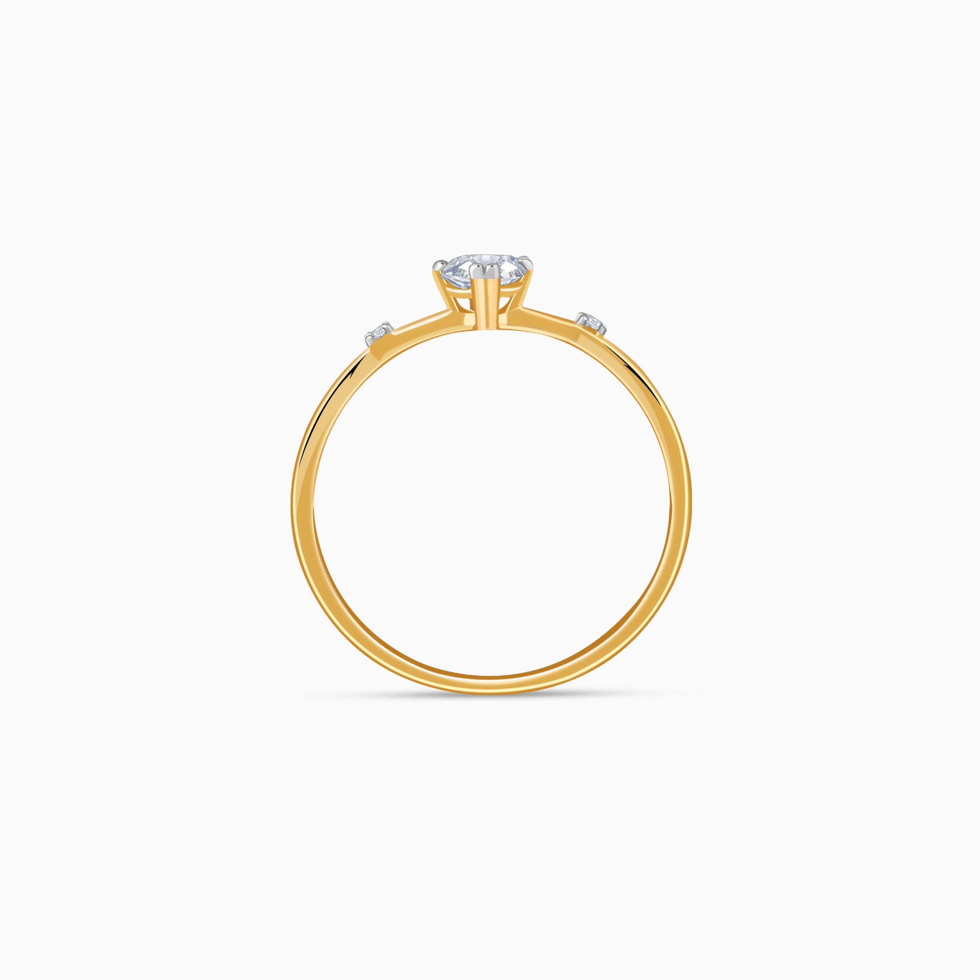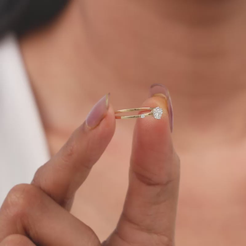 The three lab diamonds represent the simple, profound phrase, "I love you." The larger centre stone is the conviction of the word "love," while the side stones are the "I" and "you," forever connected and essential. This gold ring for women holds a small, brilliant, round lab grown diamond in a charming, floral-inspired cluster or prong setting. Two tiny, flush-set accent diamonds flank the centre, enhancing the overall balanced design. Discover exquisite lab grown diamond jewellery from Heer By GIVA today.