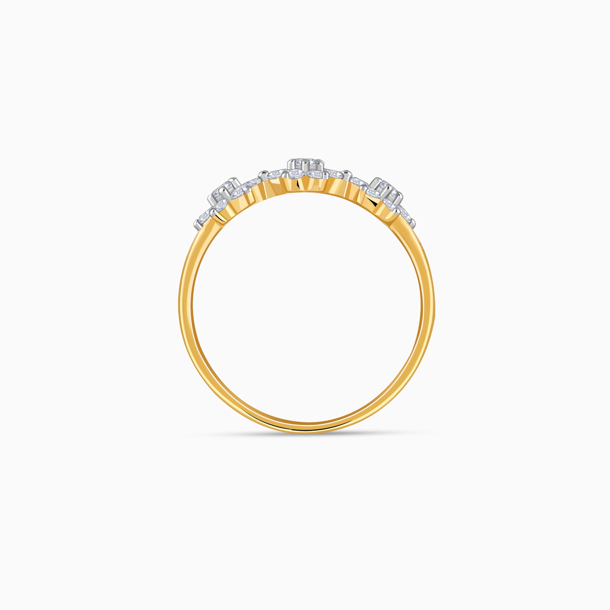 This pure gold ring for women showcases three evenly spaced floral designs, each studded with lab grown diamonds.