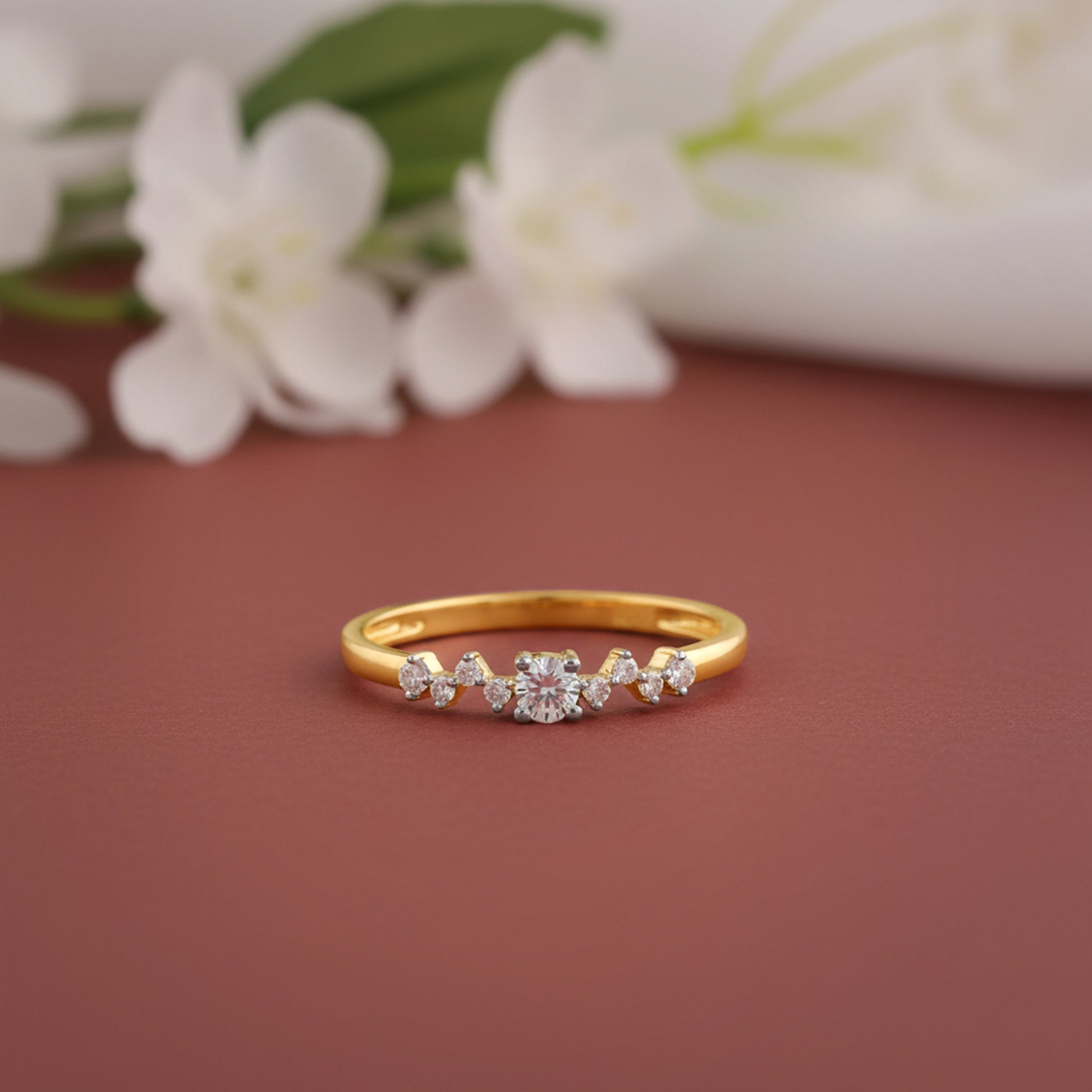 This gold ring features lab grown diamonds in a delicate prong setting along the band, crowned with a dazzling centre diamond. For the kind of woman who sparkles with grace and a touch of whimsy. Try the exquisite lab grown diamond jewellery from Heer By GIVA today.