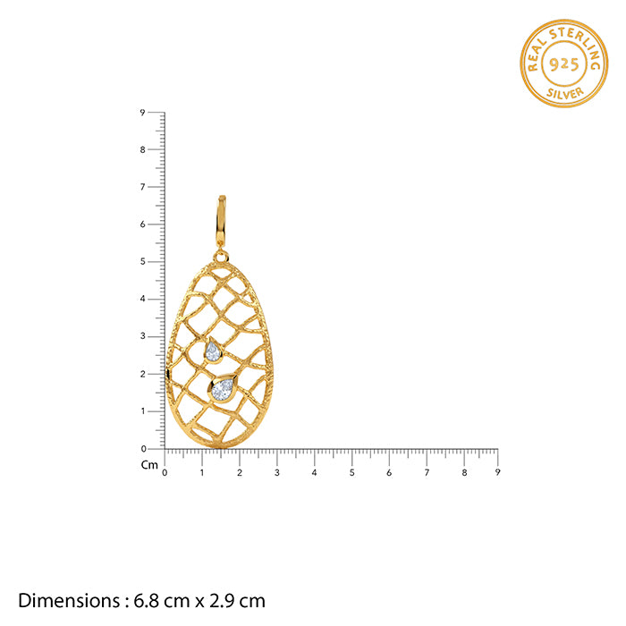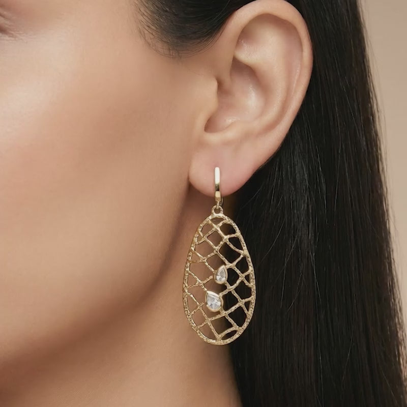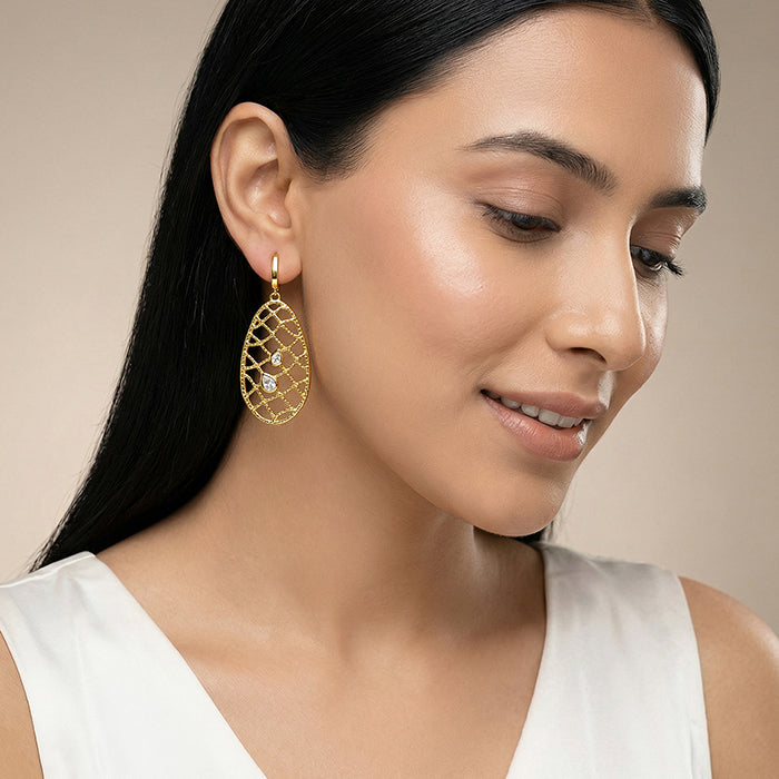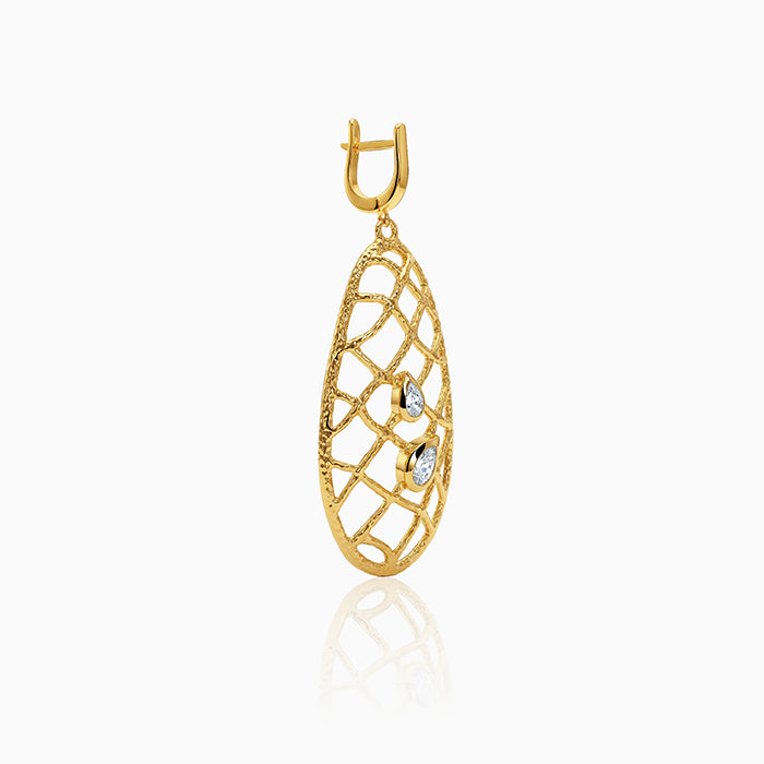 These gold plated earrings shaped in a teardrop silhouette, where sleek abstract lines flow within, set with zircons that catch light in motion. A fluid form with a quiet sparkle.