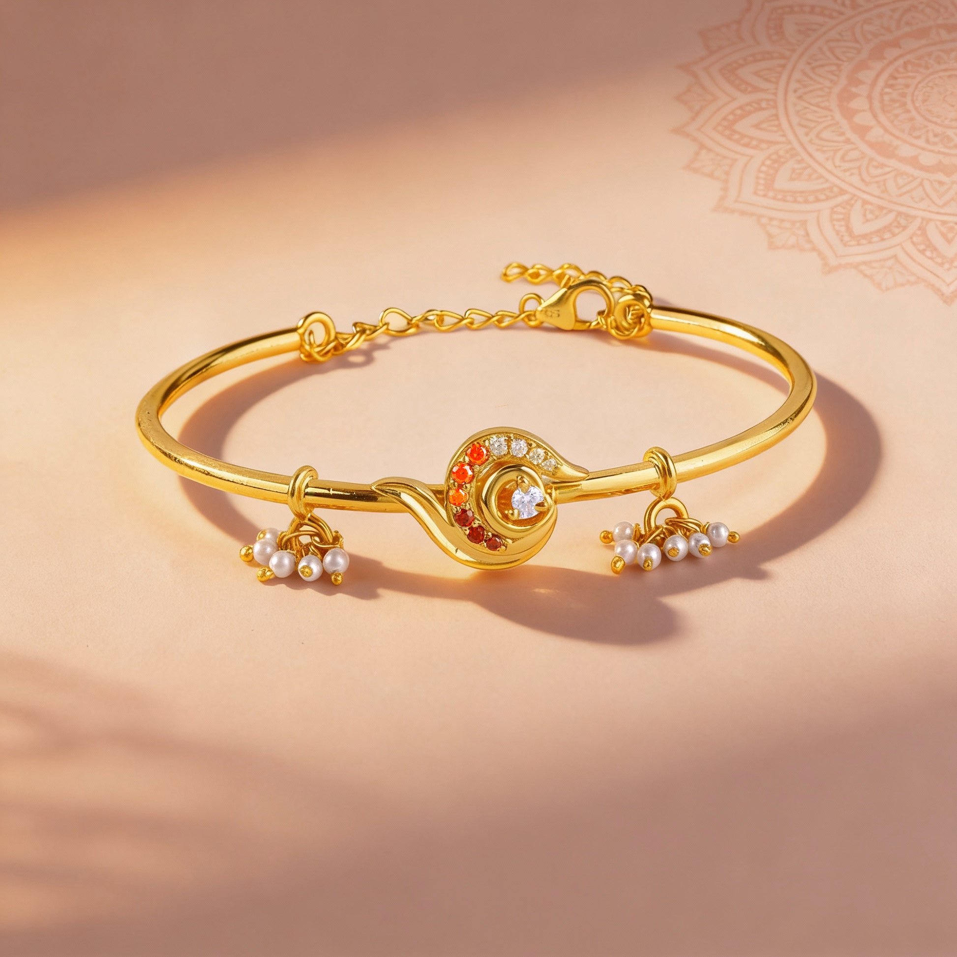 A traditional golden bracelet with a soft, graceful shine that suits every moment, from family gatherings to your 9-to-5. It features a central spiral motif set with coloured stones and dangling clusters of small pearls enhance the ends of the motif.