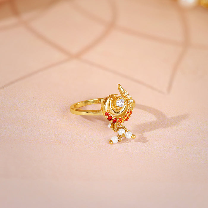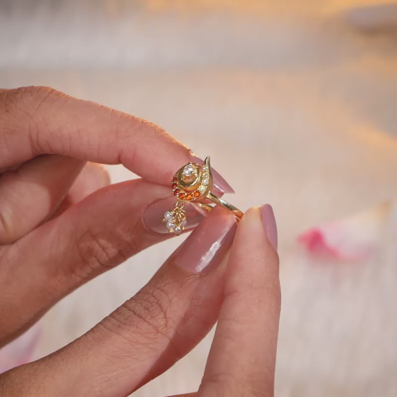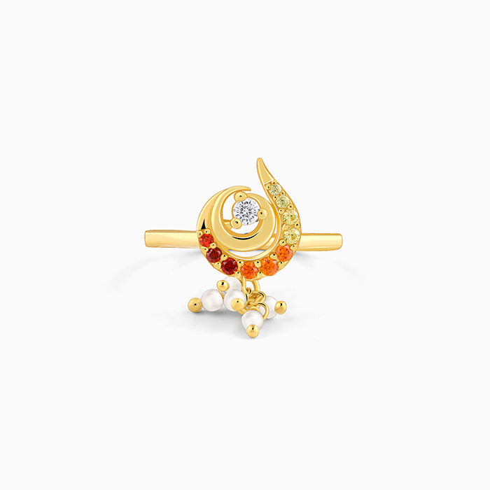 This gold plated ring for women features a swirl-inspired design, studded with colourful zircons and zircons. A cluster of pearls hangs below. Designed in Italy. Inspired by India. Embrace the goddess within with the Shakti Collection by GIVA x Anna Giulia Chicco.