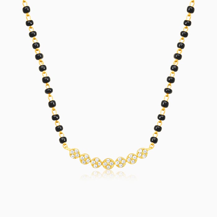This golden mangalsutra features set of flower motifs with zircons, and the chain is embellished with black beads.