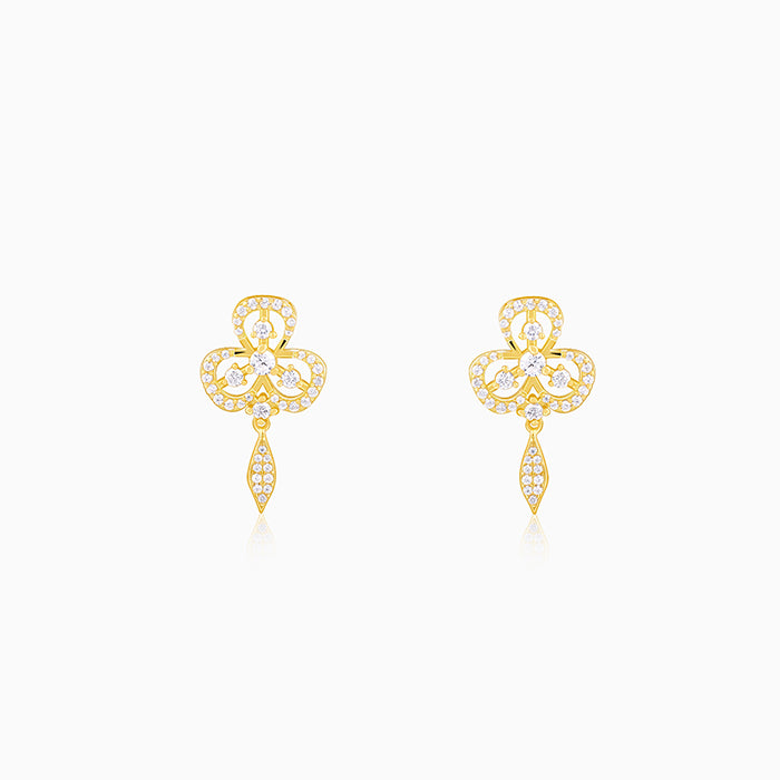 When your vibe is calm but your glow is loud, these earrings step in and say the rest. These gold plated earrings for women feature a clover-shaped motif set with zircons, paired with a cascading central drop also studded with smaller zircons.