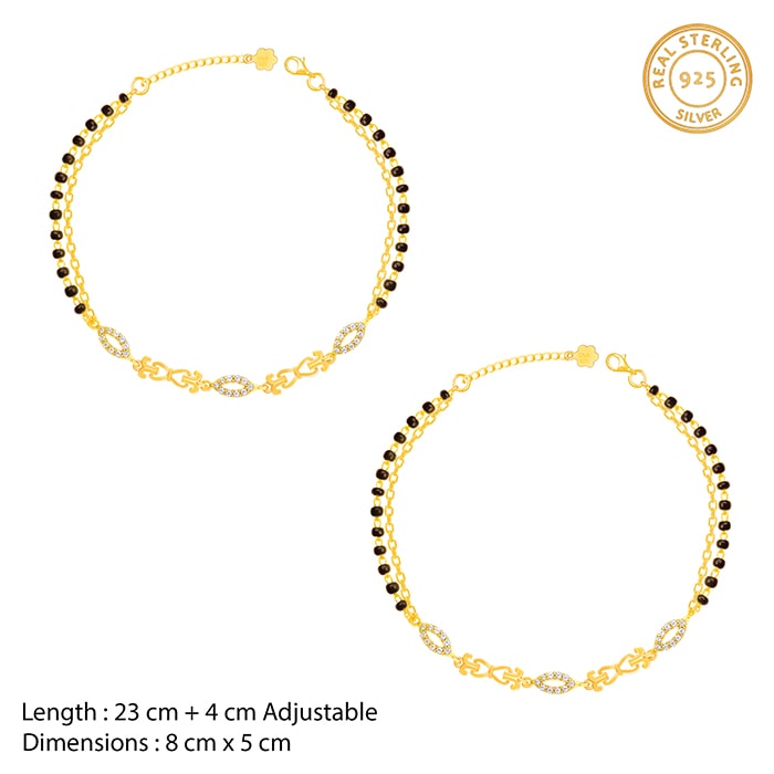 The Golden Anklet has oval shaped motif studded with zircons and black beads.