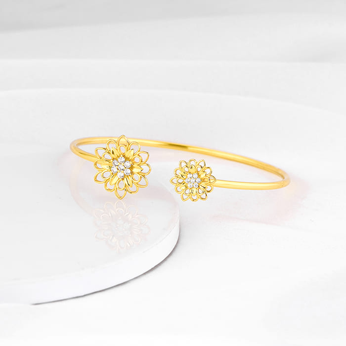 This golden cuff bracelet has been handcrafted especially for YOU! This bracelet has been intricately designed to match nature’s peerless brilliance. Zircon studded gold has been delicately crafted to represent a flower in full bloom, capturing the true essence of nature.