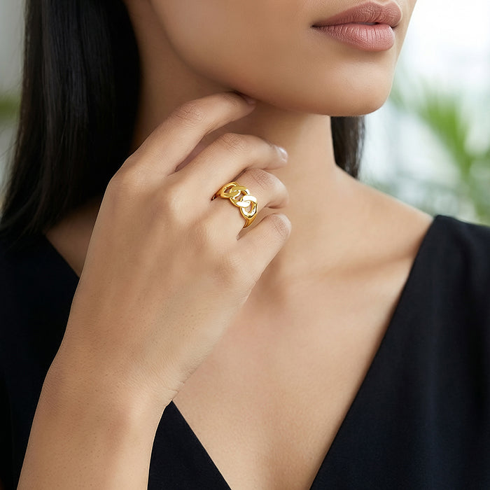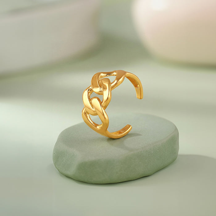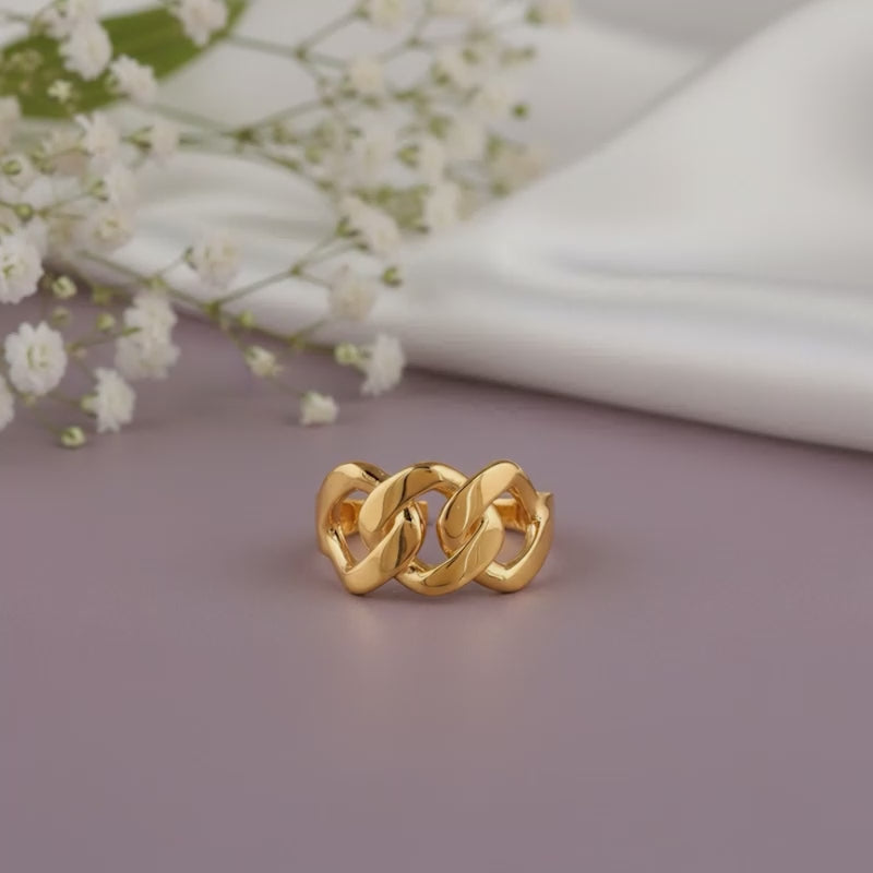 This silver ring with gold plating features chain-like links that intertwine to form a bold statement with fluid movement. Created for the woman who mixes edge with polish and likes her jewellery to feel confident and contemporary.